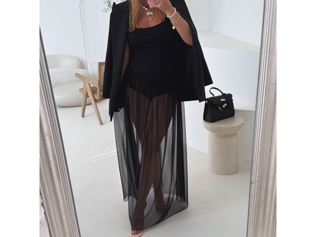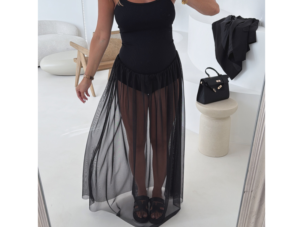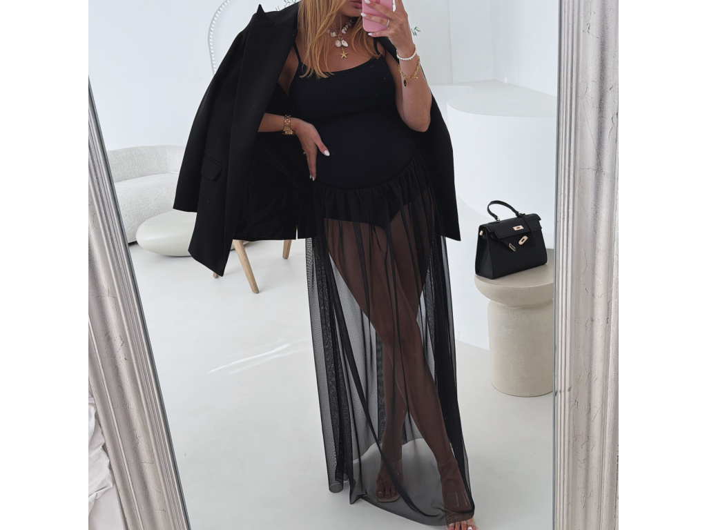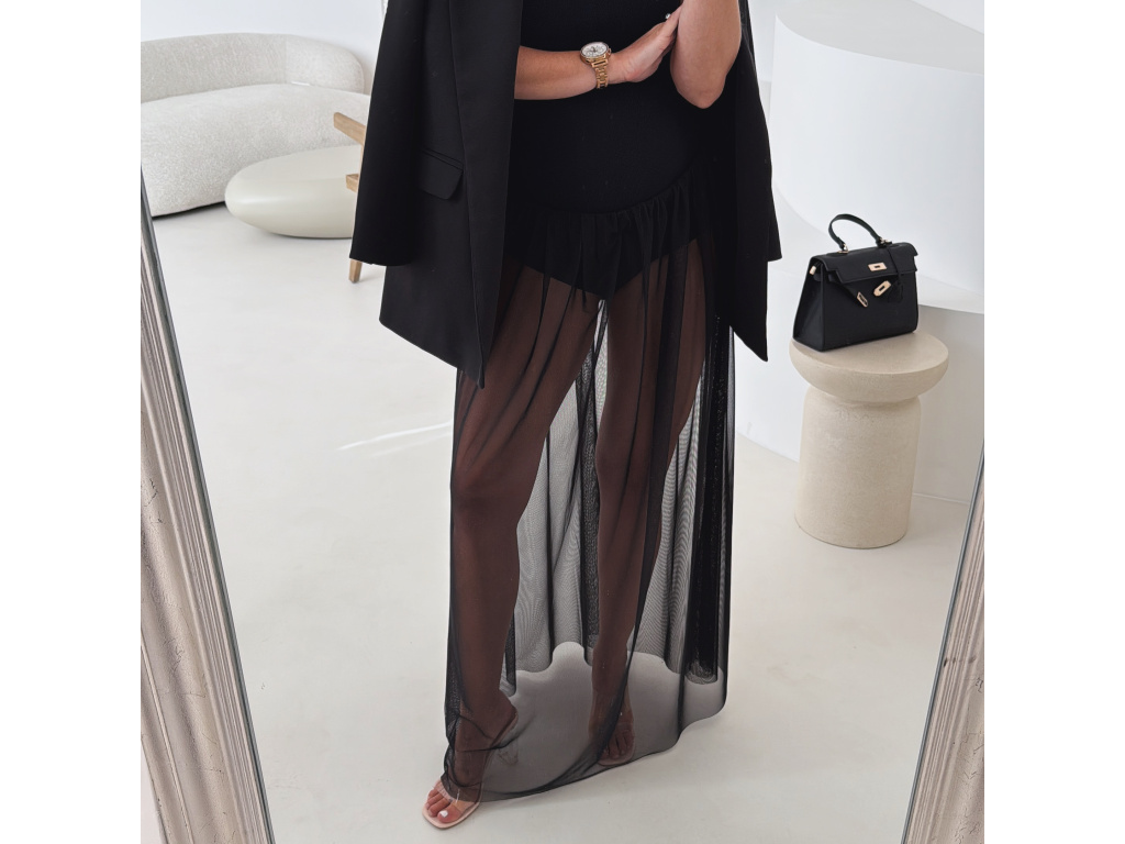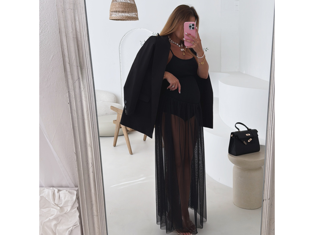 Elegantní dlouhá sukně z jemného průsvitného tylu s pružným pasem do gumy. Uvnitř je pohodlná kalhotková podšívka, která dodává sukni moderní a sexy vzhled. Ideální na letní večírky, dovolené i festivaly – snadno ji zkombinujete s body nebo crop topem. Velikost je univerzální, sedí na XS, S a M.