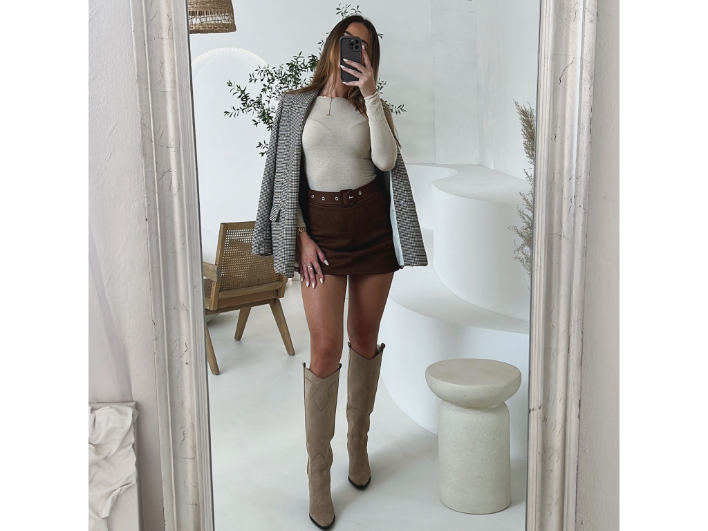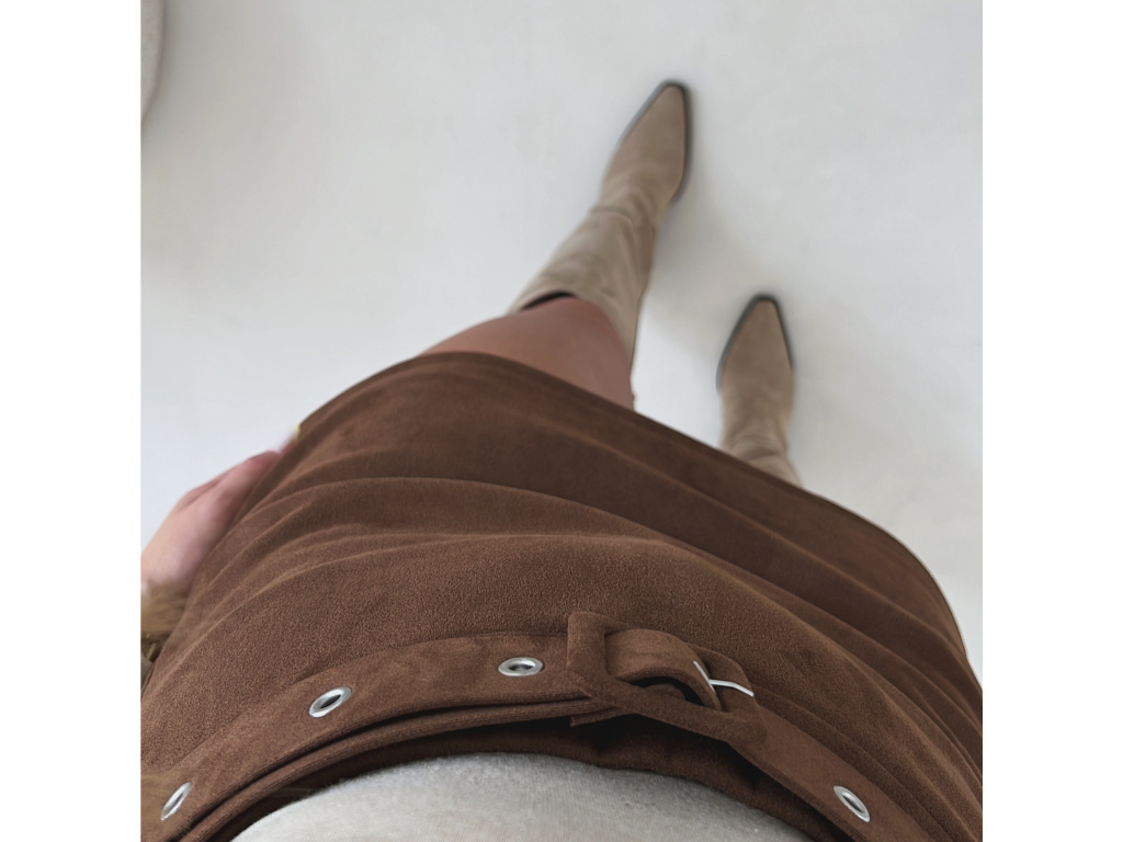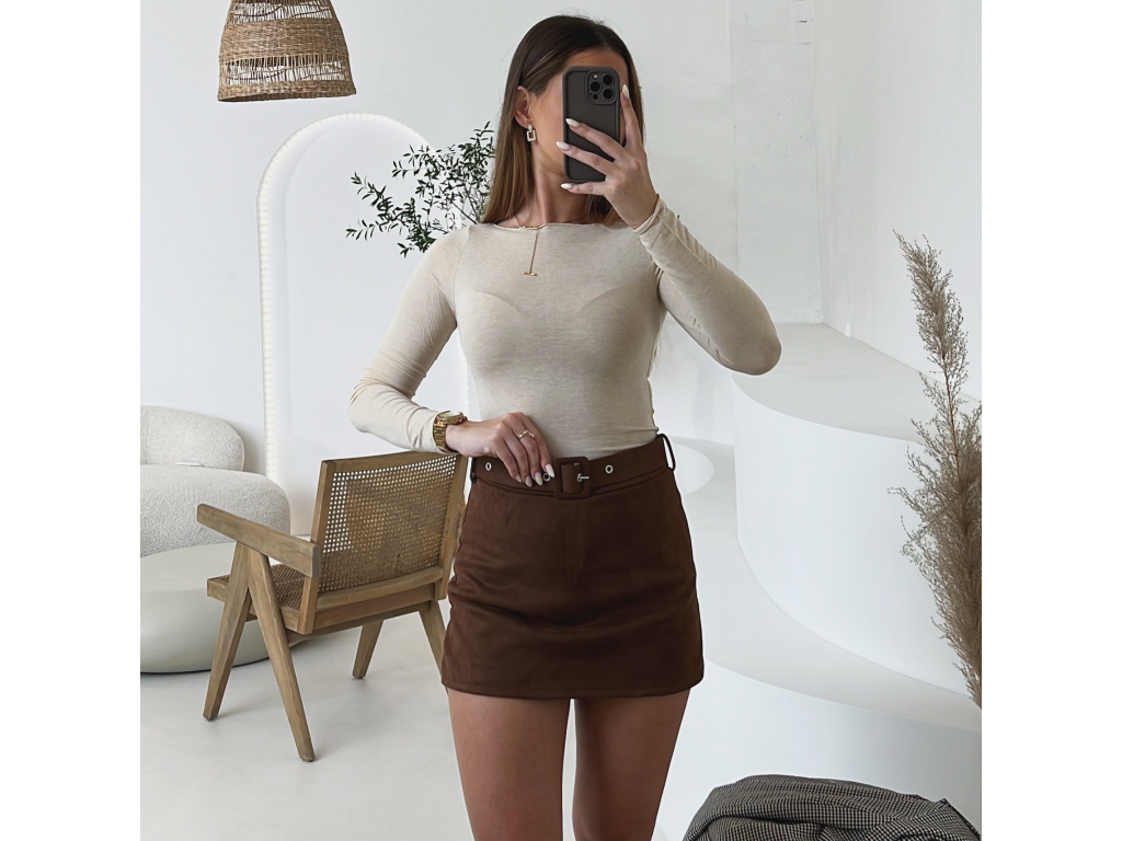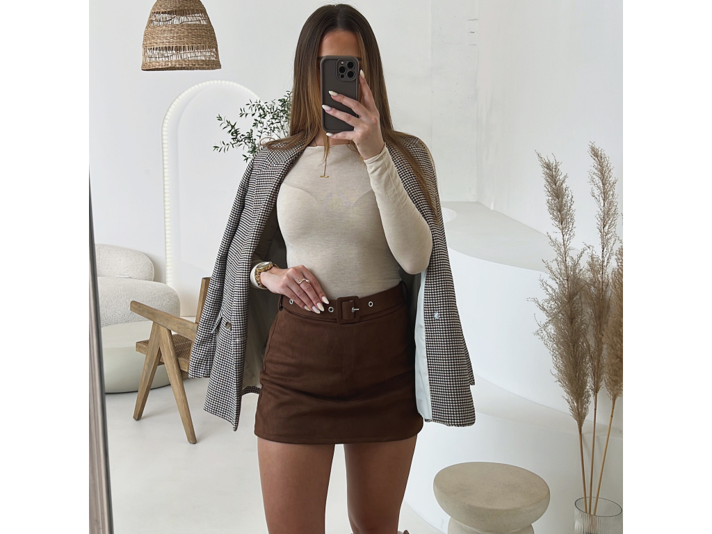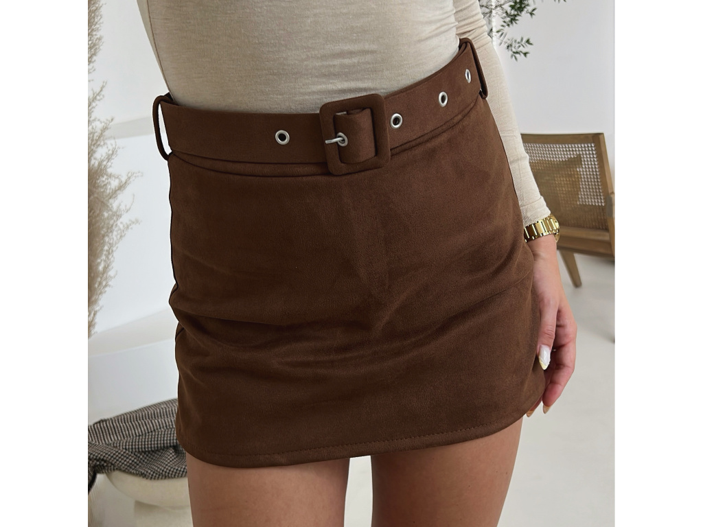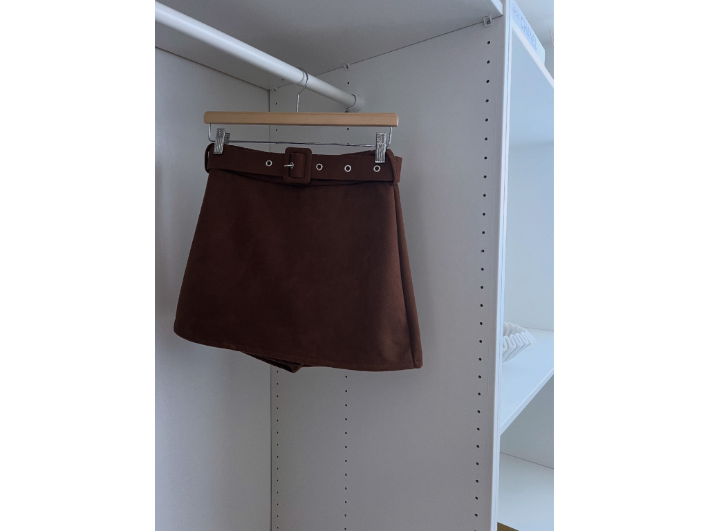 Elegantní skort – spojení sukně a šortek – který vám zajistí pohodlí i styl v jednom. Vyrobený z jemného semišového materiálu, doplněný o pásek ve stejném designu, který krásně zvýrazní pas. Díky praktickému střihu vypadá jako sukně, ale nabízí komfort šortek. Univerzální kousek vhodný jak k elegantní košili, tak i k volnějšímu topu. Velikost je univerzální, sedí na XS,S a M. Pásek není vhodný k praní!