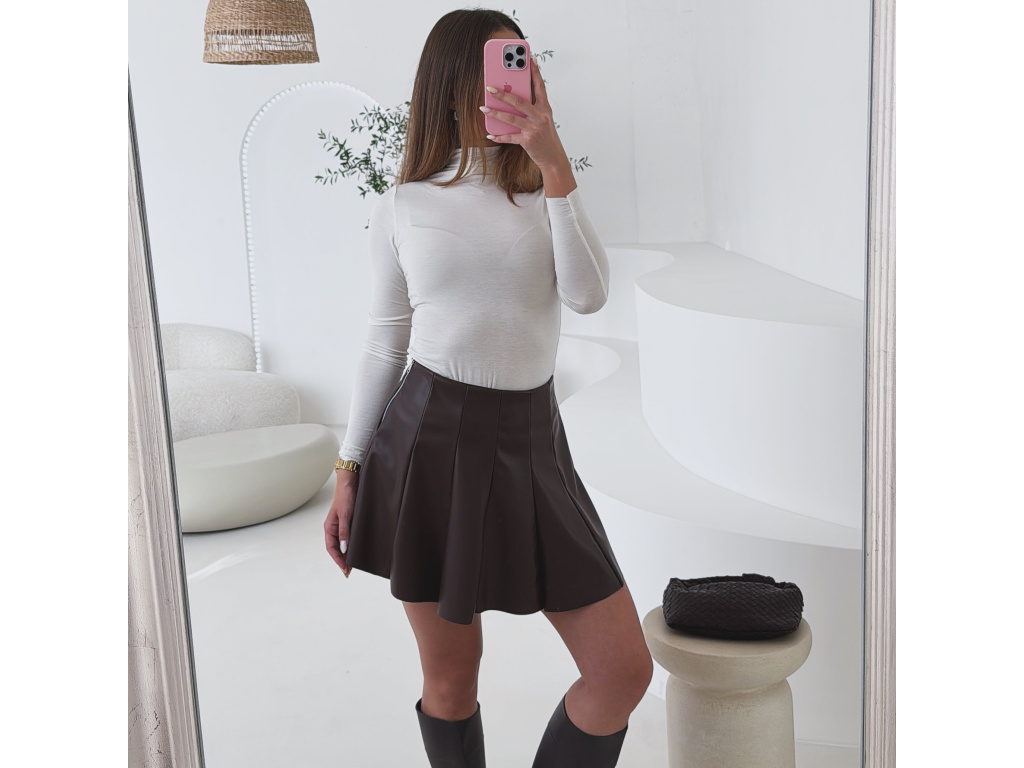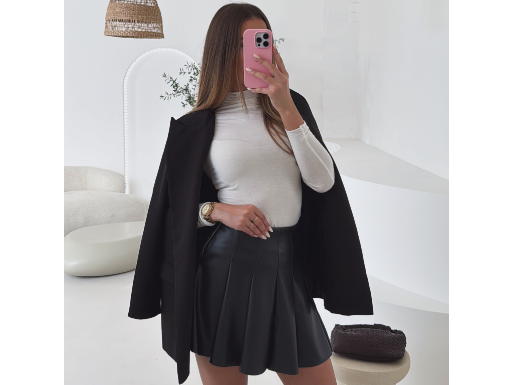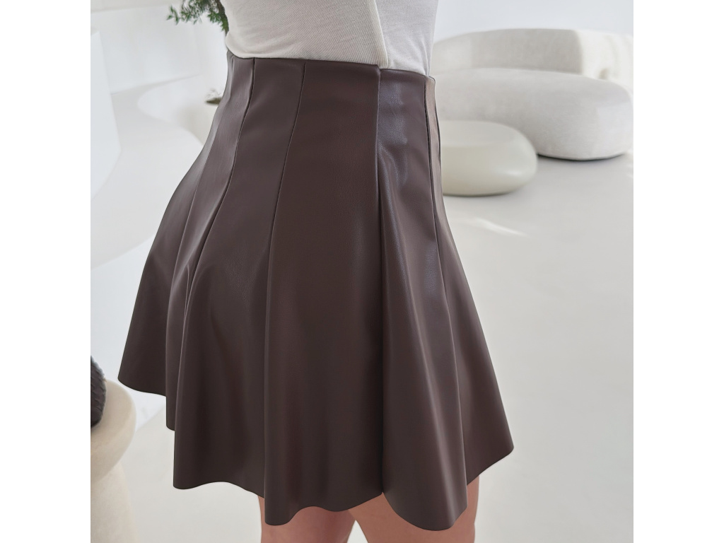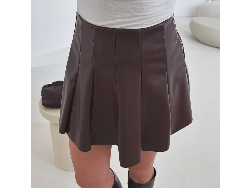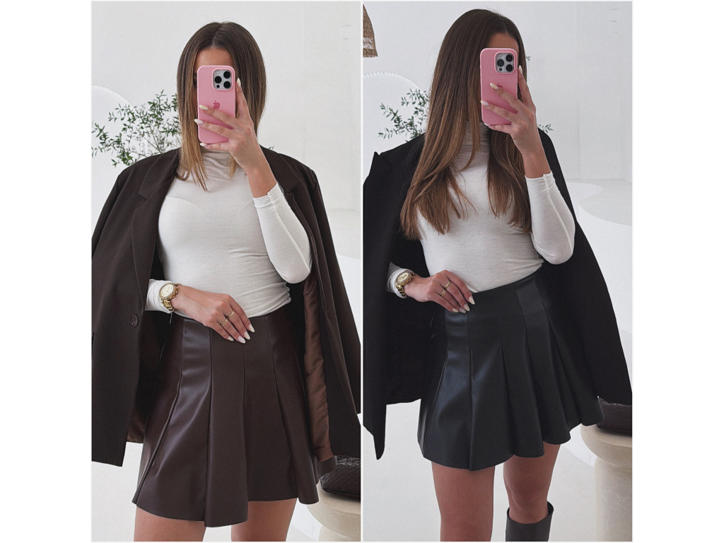 Stylová koženková skládaná sukně v černé a hnědé barvě. Má elegantní střih se zapínáním na zip na boční straně a působí moderně i nadčasově. Skvěle padne díky dostupným velikostem S, M a L. Ideální volba pro kombinaci s basic topem, svetrem nebo sakem – dokonale doladí jakýkoliv outfit.