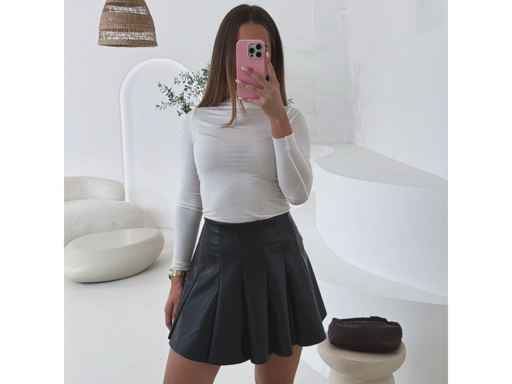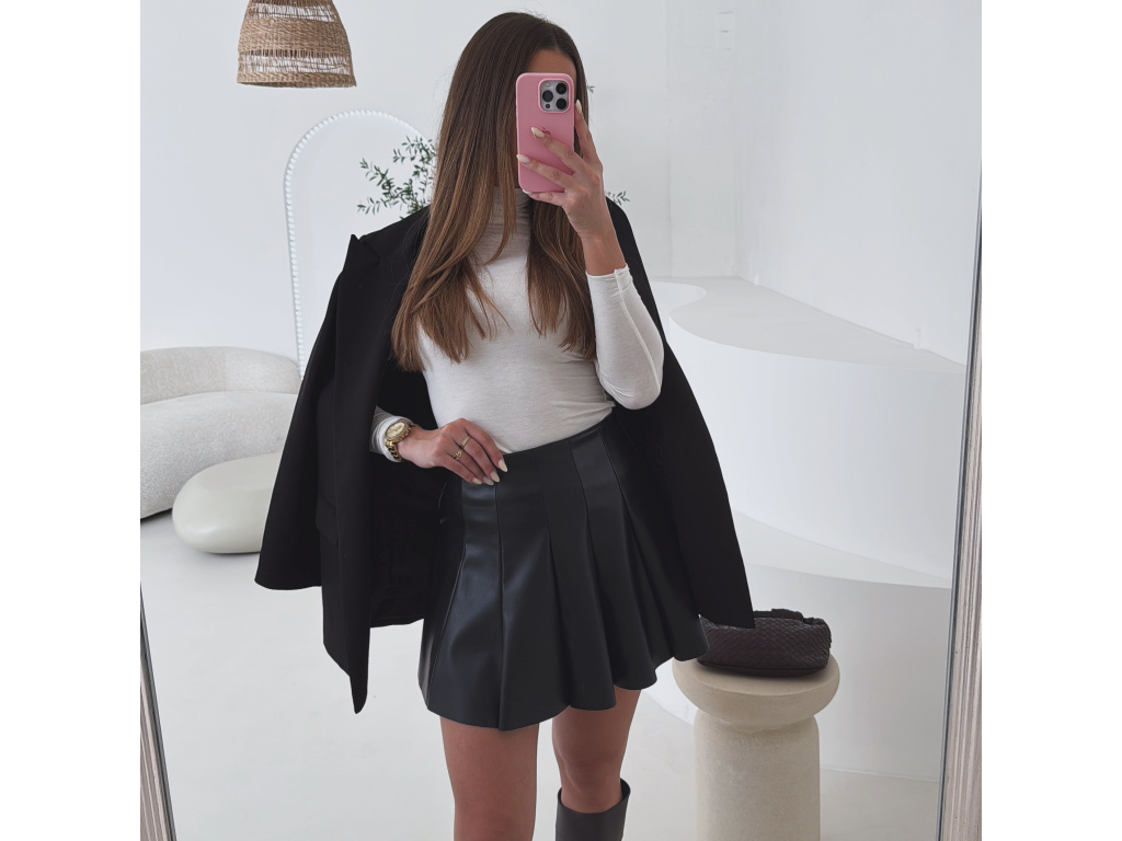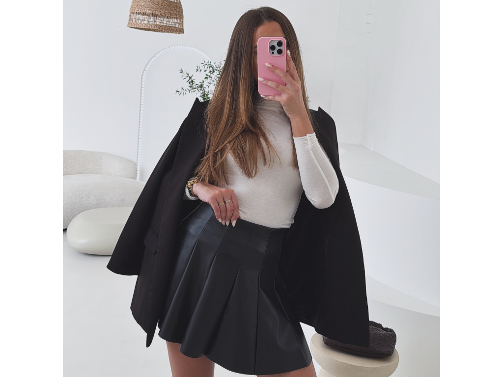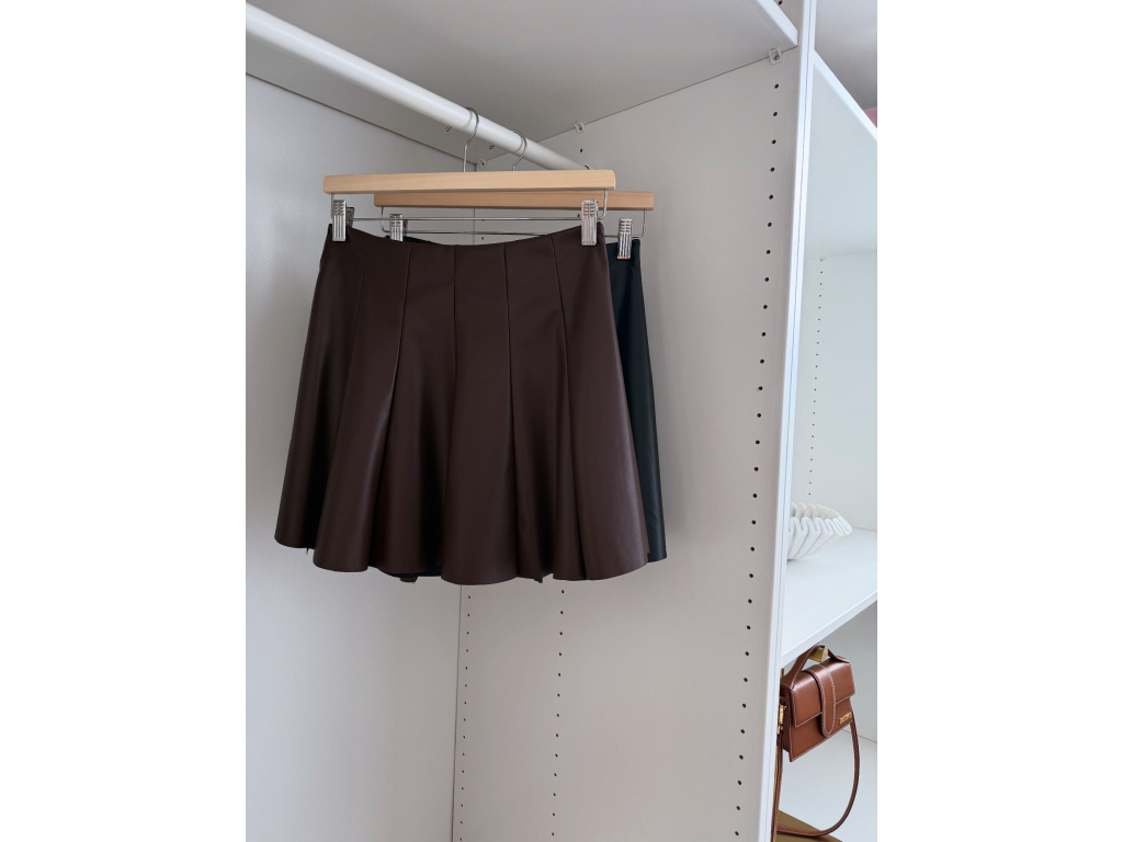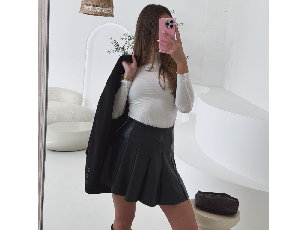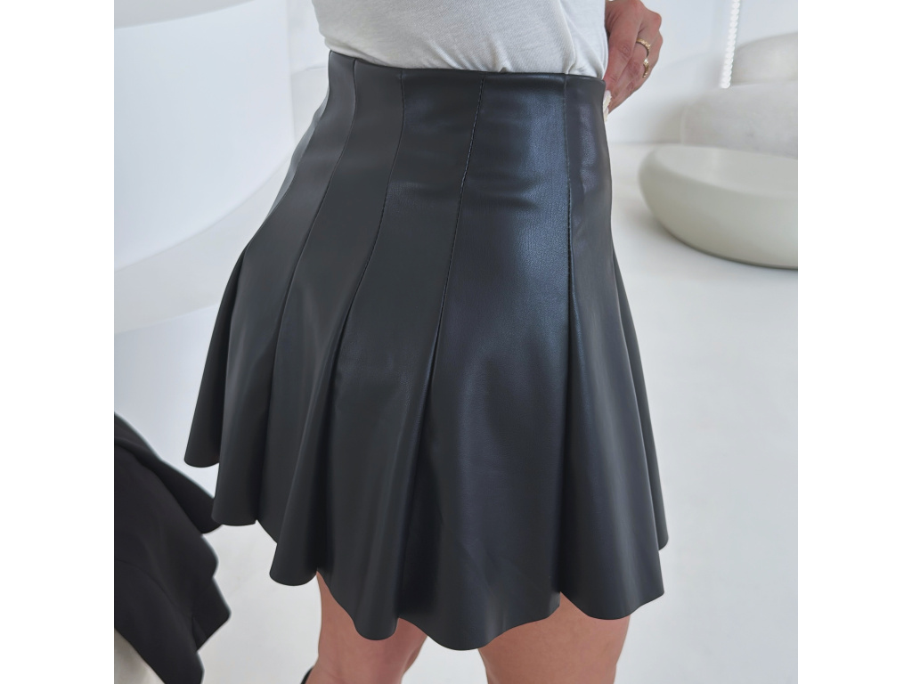 Stylová koženková skládaná sukně v černé a hnědé barvě. Má elegantní střih se zapínáním na zip na boční straně a působí moderně i nadčasově. Skvěle padne díky dostupným velikostem S, M a L. Ideální volba pro kombinaci s basic topem, svetrem nebo sakem – dokonale doladí jakýkoliv outfit.