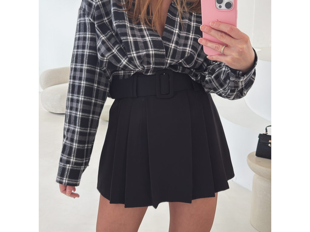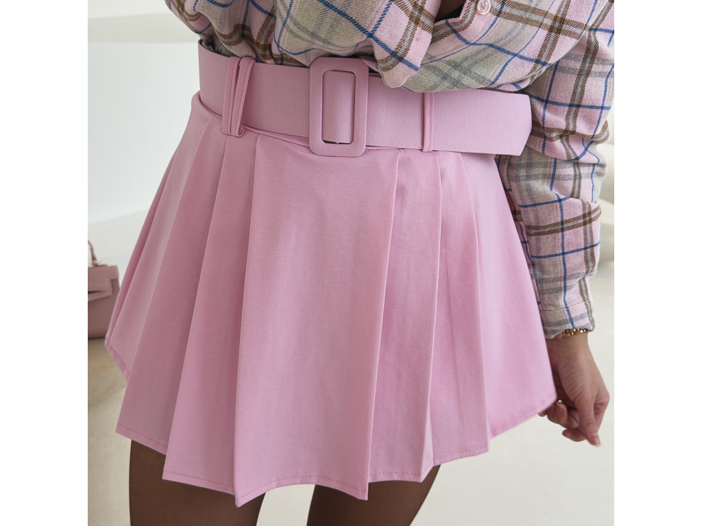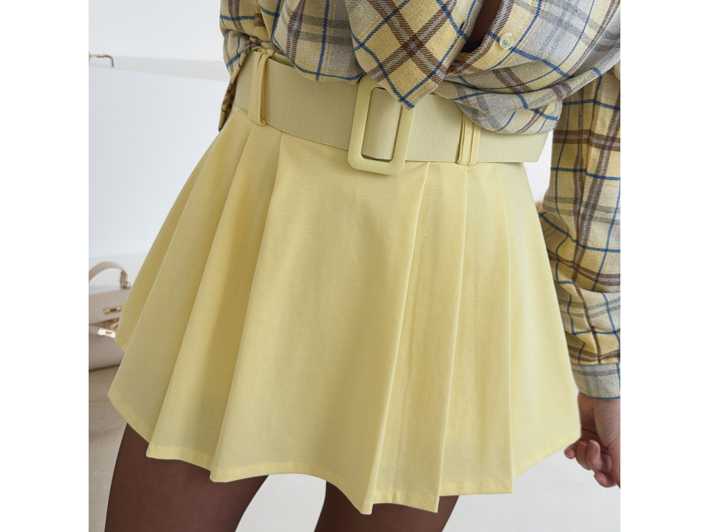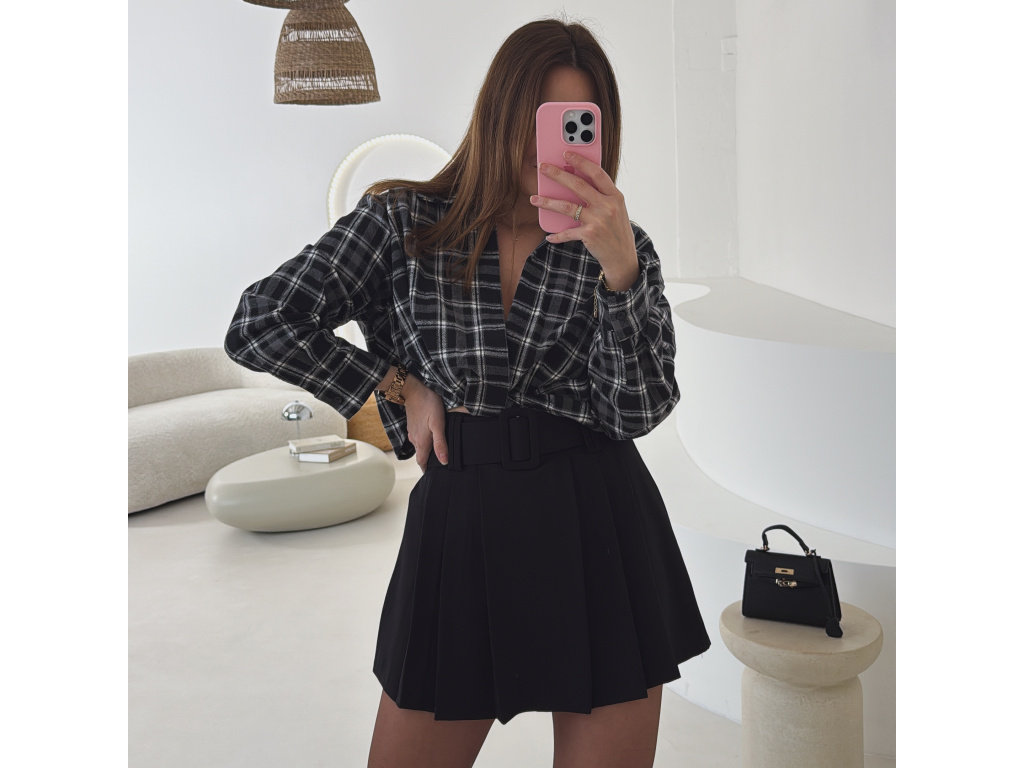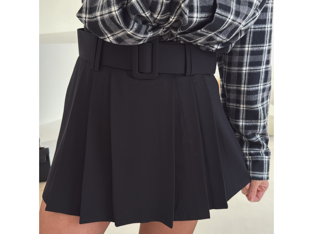 Stylová sukně s elegantním páskem a praktickými všitými šortkami, které zajišťují maximální pohodlí a jistotu při nošení. Áčkový střih krásně zvýrazní pas a působí žensky a upraveně. Ideální volba pro každodenní nošení i stylové outfitové kombinace. Velikost univerzální, sedí na XS-M.