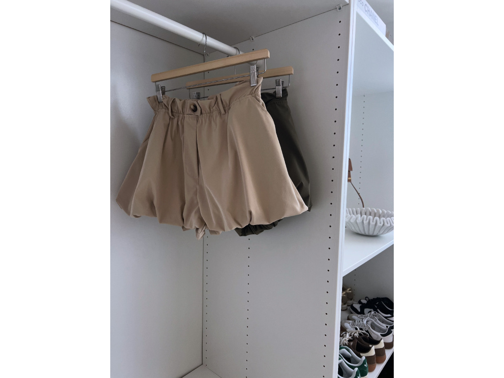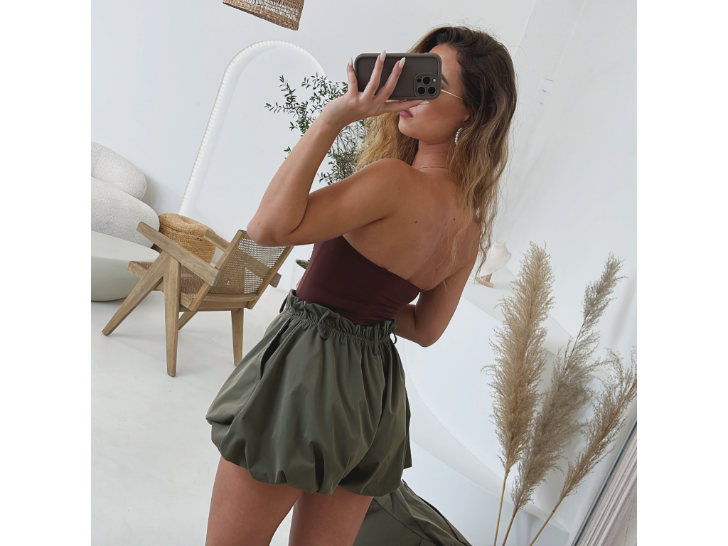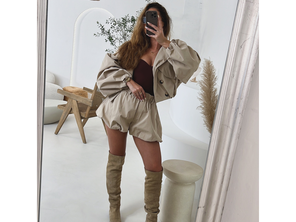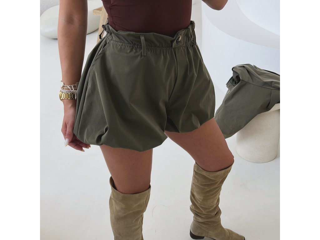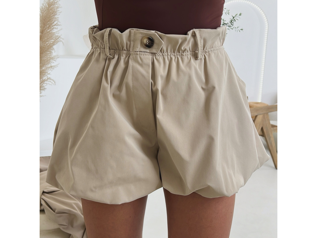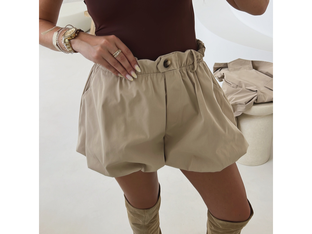Stylové balónové šortky s elastickým pasem v khaki a béžové barvě jsou ideální pro pohodlné i trendy outfity. Mají volnější střih s lehkým efektem balónku, vyšší pas s poutky na pásek a jsou vč. podšívky. Dostupné ve velikostech S, M a L a lze je kombinovat i do setu s trenčkotem ze stejné kolekce.