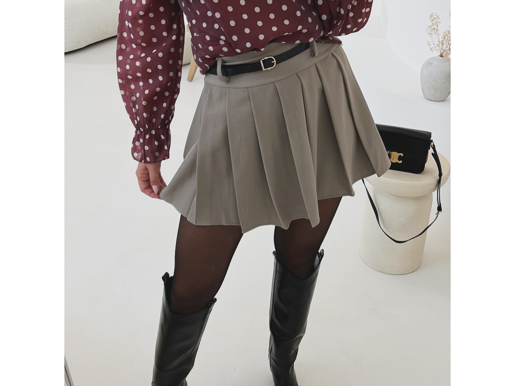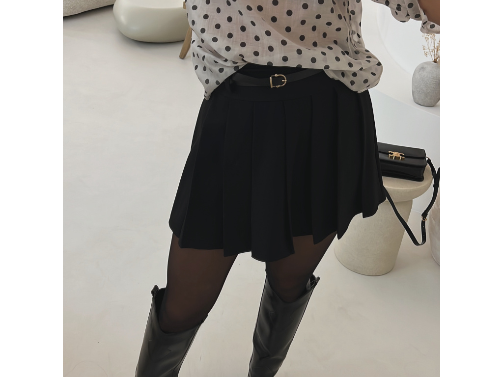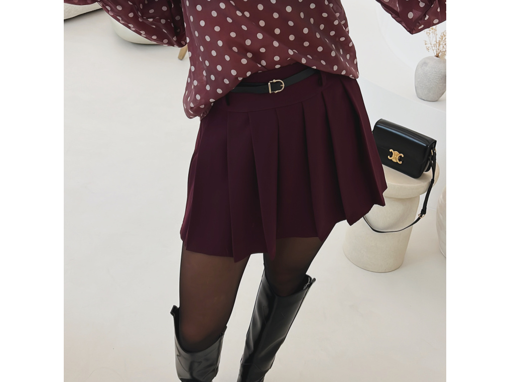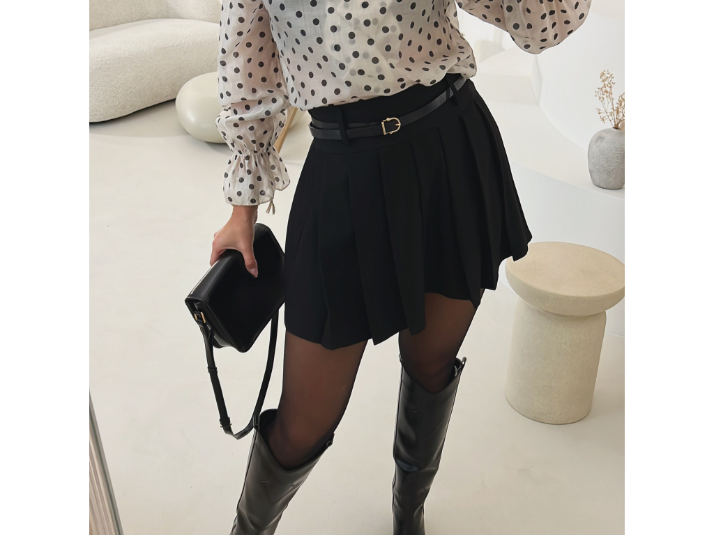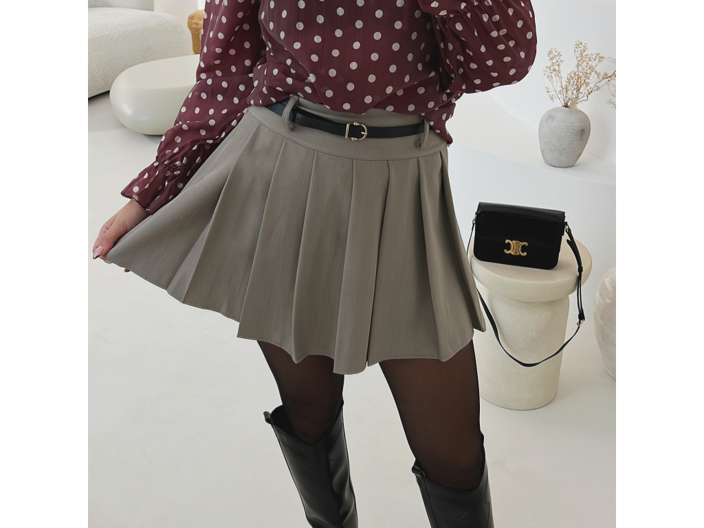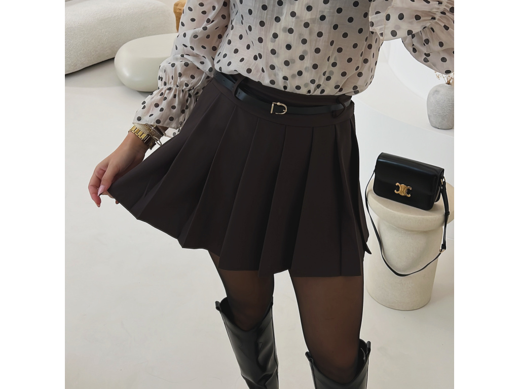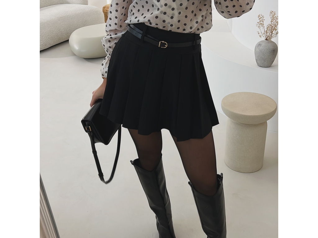 Elegantní skládaná sukně s páskem, která dokonale kombinuje ženskost a pohodlí. Díky pružnému pasu na zadní straně se krásně přizpůsobí postavě, zatímco boční zapínání usnadňuje oblékání. Přiložený pásek s kovovou přezkou podtrhne pas a dodá outfitu šmrnc. Kombinuj s halenkou nebo jednoduchým topem a kozačkami pro chic look. Velikost je univerzální, sedí na XS,S a M.