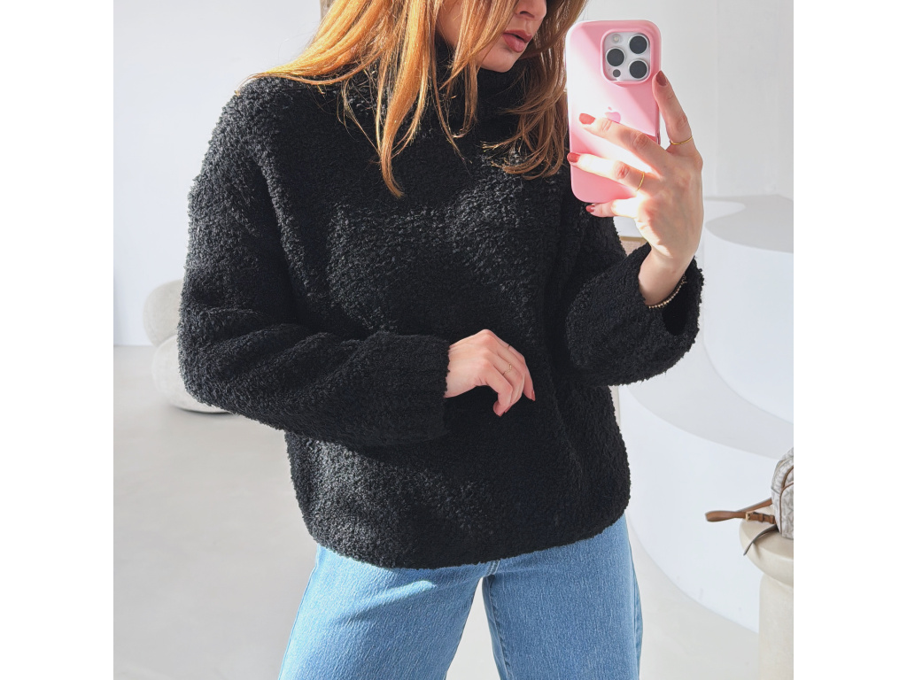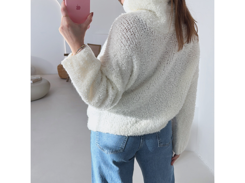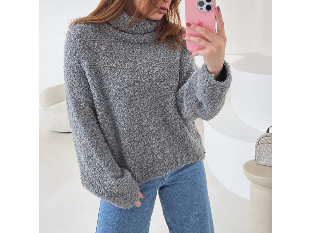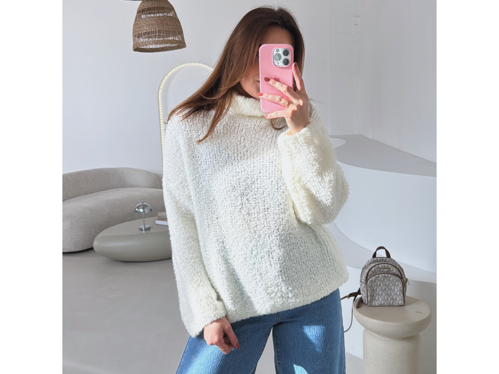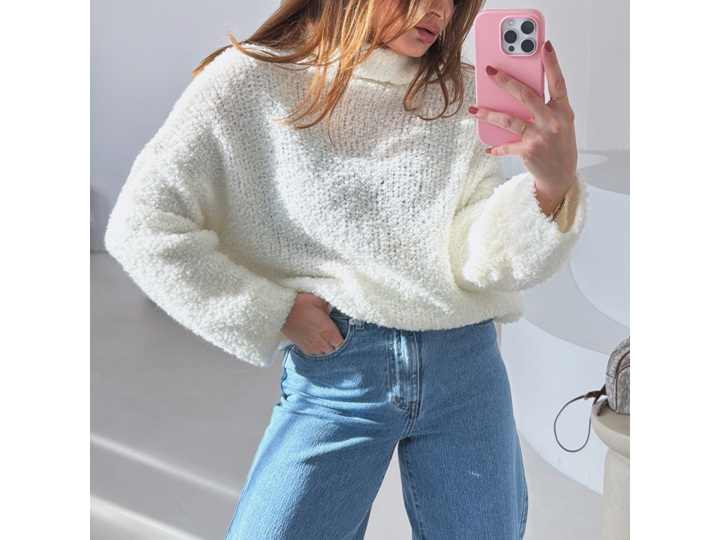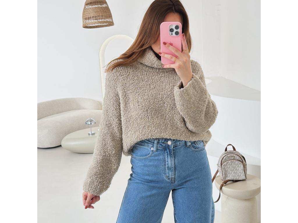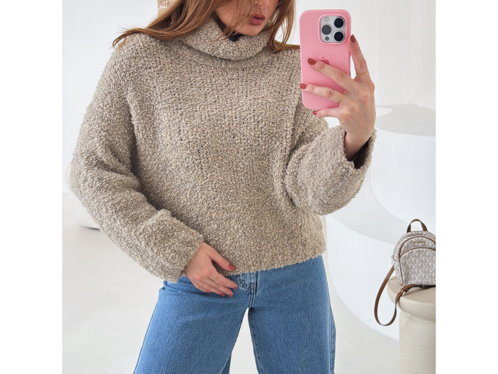 Hřejivý svetr s buklé (nopkovou) strukturou a pohodlným rolákem. Příjemný materiál s podílem vlny a alpaky krásně zahřeje a je ideální na chladnější dny. Volnější střih zajišťuje komfort při nošení a snadné kombinování s džíny i kalhotami.