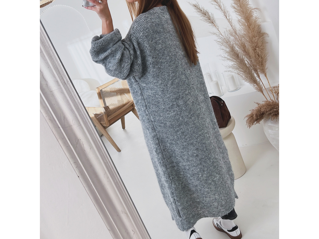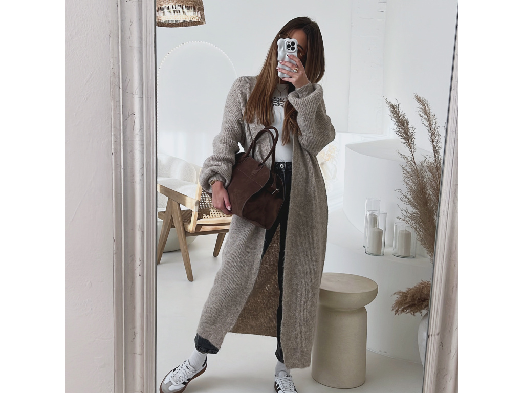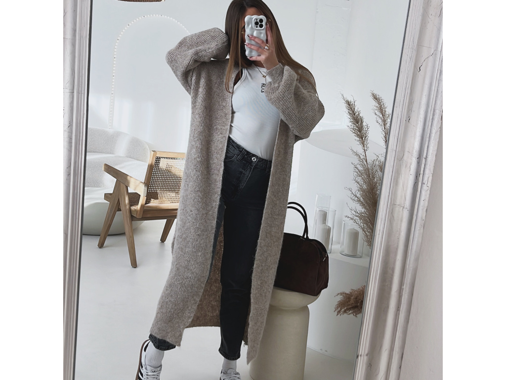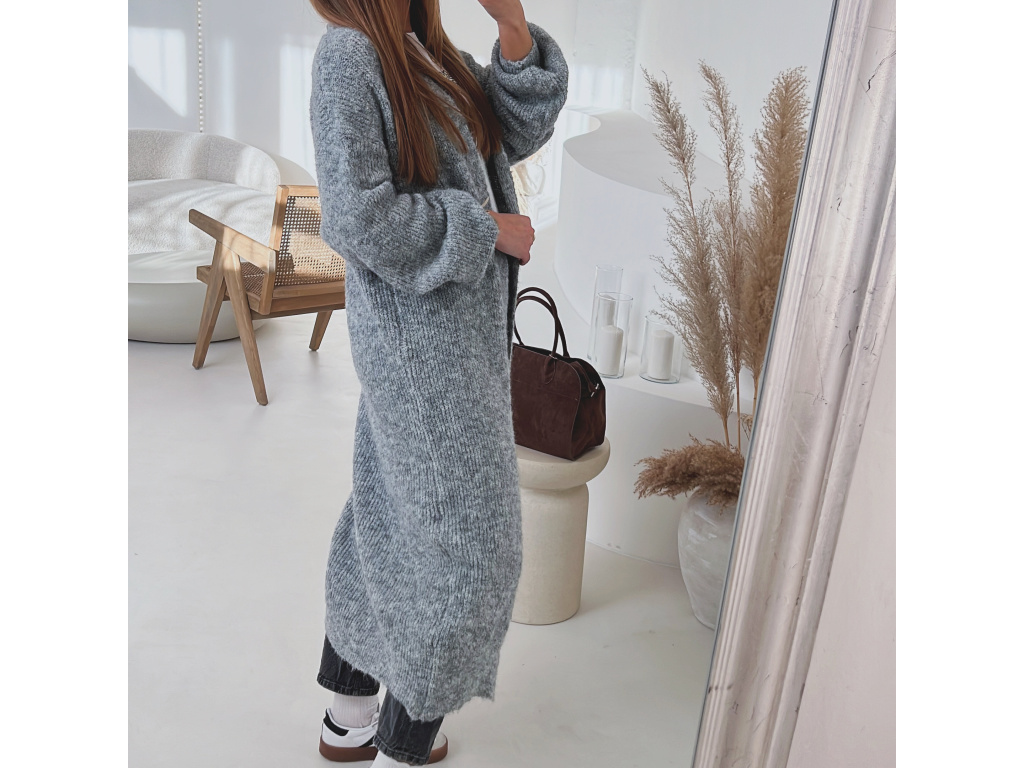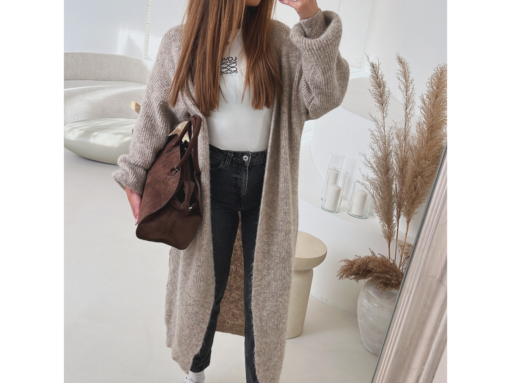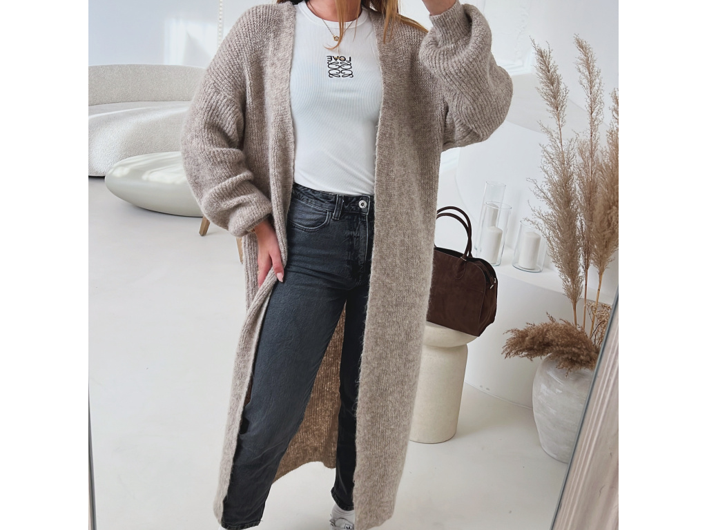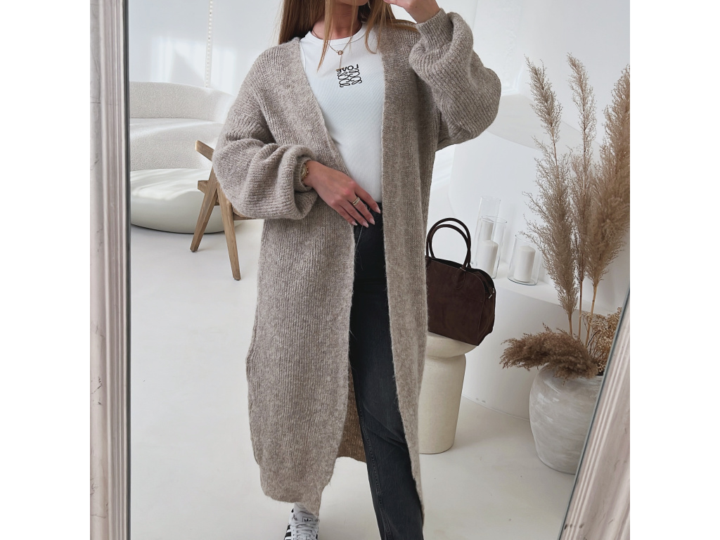 Stylový a hřejivý dlouhý kardigan s volnějším střihem, ideální pro vrstvení v chladnějších dnech. Příjemný měkký úplet zaručuje pohodlí i elegantní vzhled. Skvěle doplní ležérní outfit s džínami i šaty. Dostupný ve třech odstínech – šedé, béžové a hnědé.