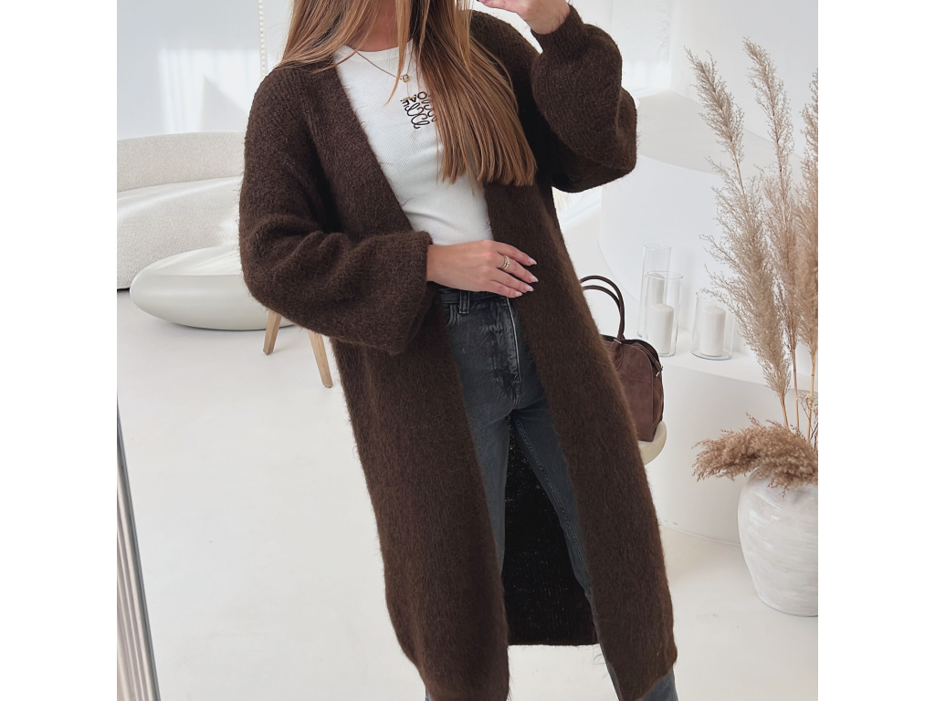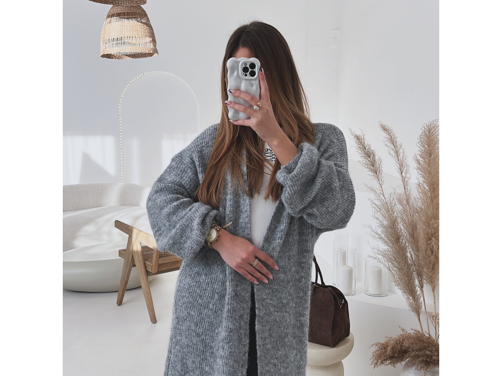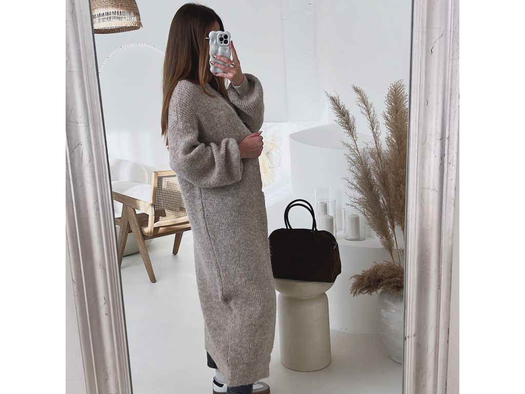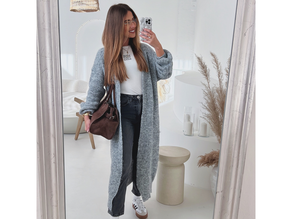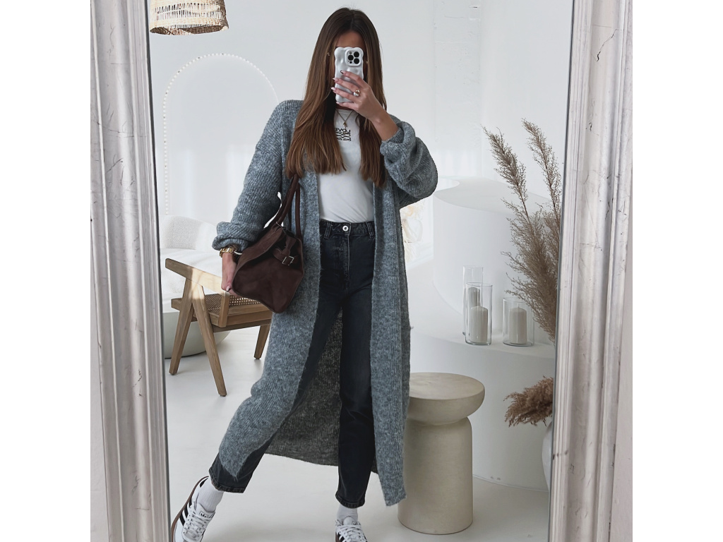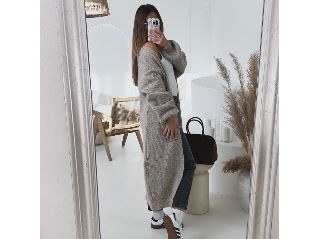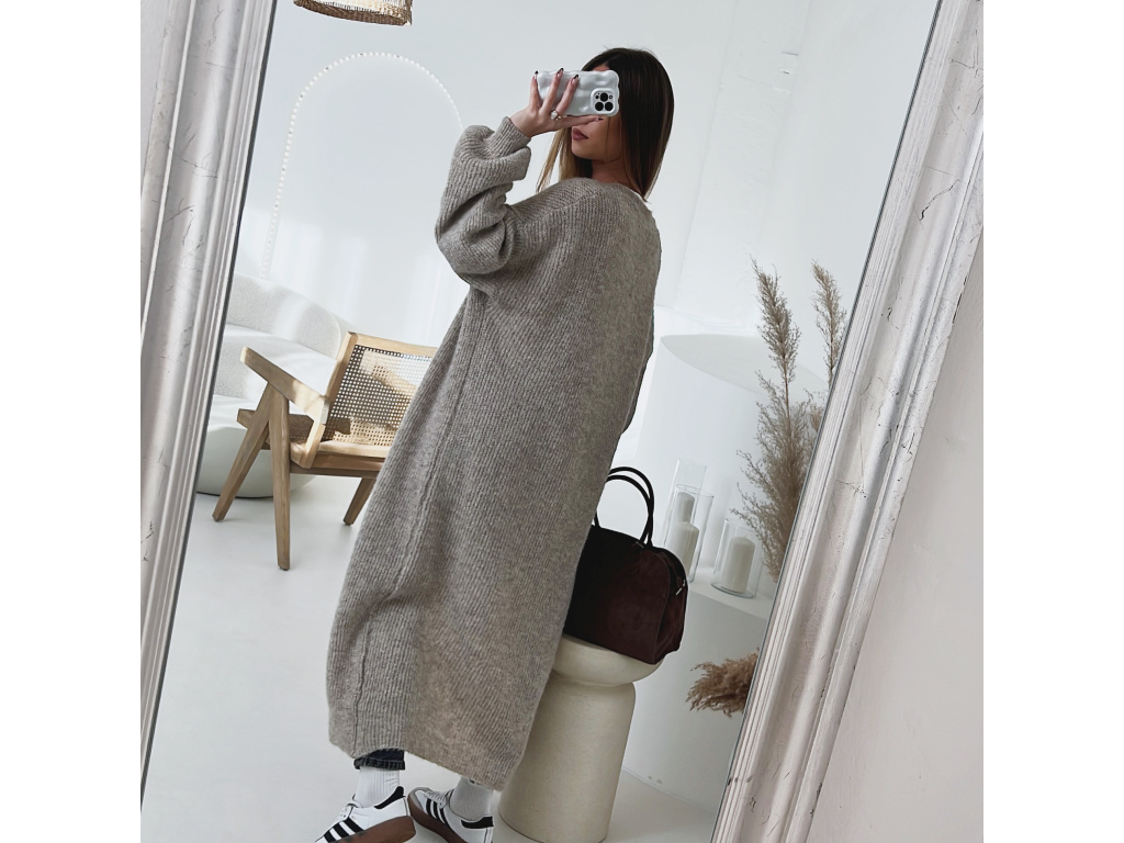 Stylový a hřejivý dlouhý kardigan s volnějším střihem, ideální pro vrstvení v chladnějších dnech. Příjemný měkký úplet zaručuje pohodlí i elegantní vzhled. Skvěle doplní ležérní outfit s džínami i šaty. Dostupný ve třech odstínech – šedé, béžové a hnědé.
