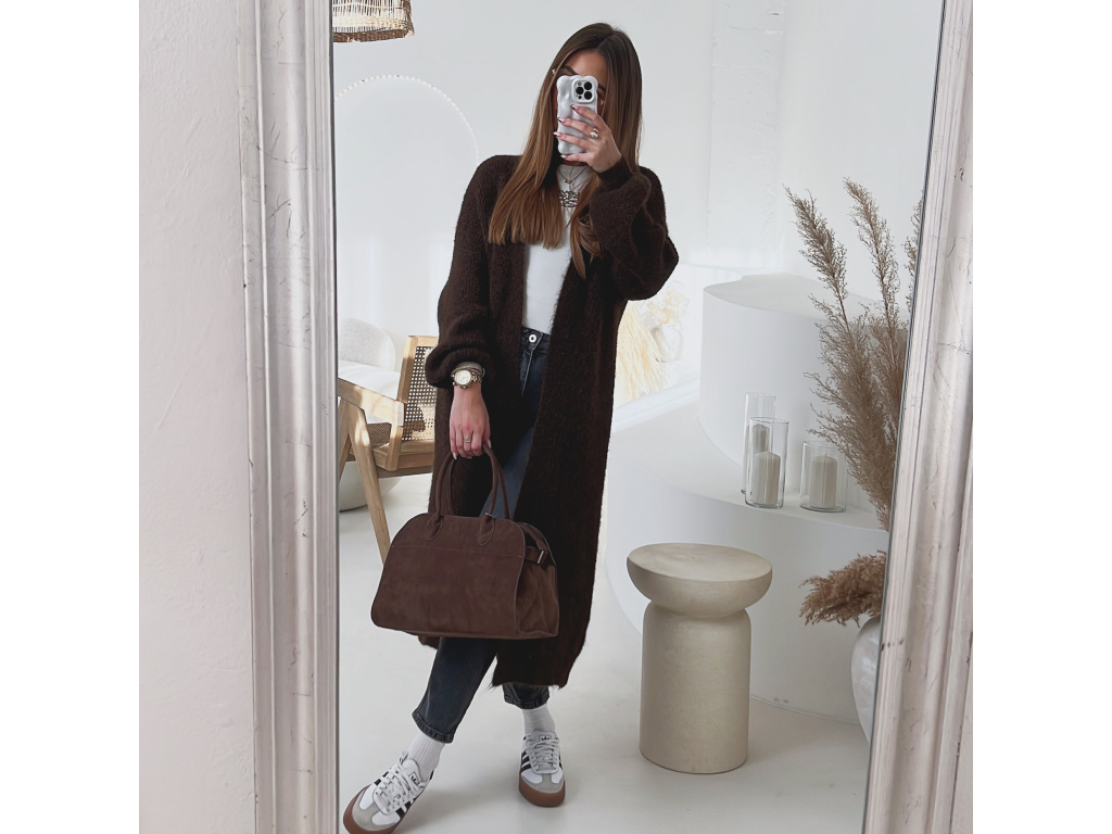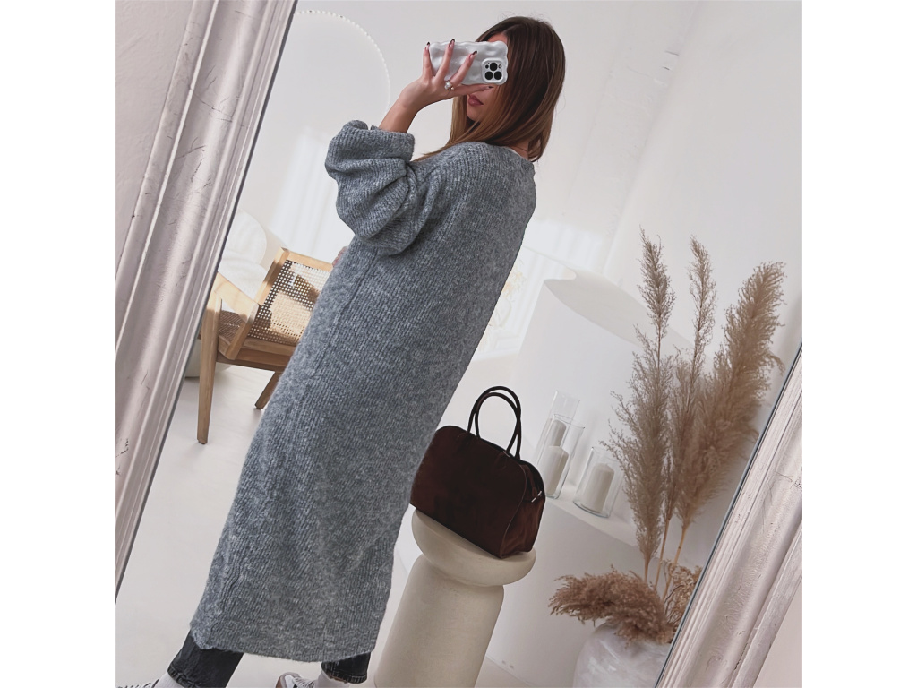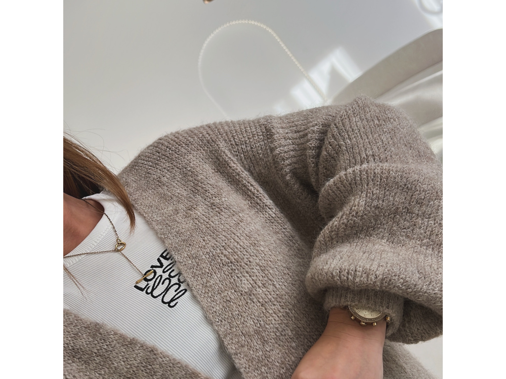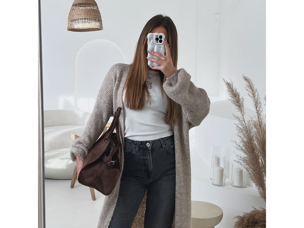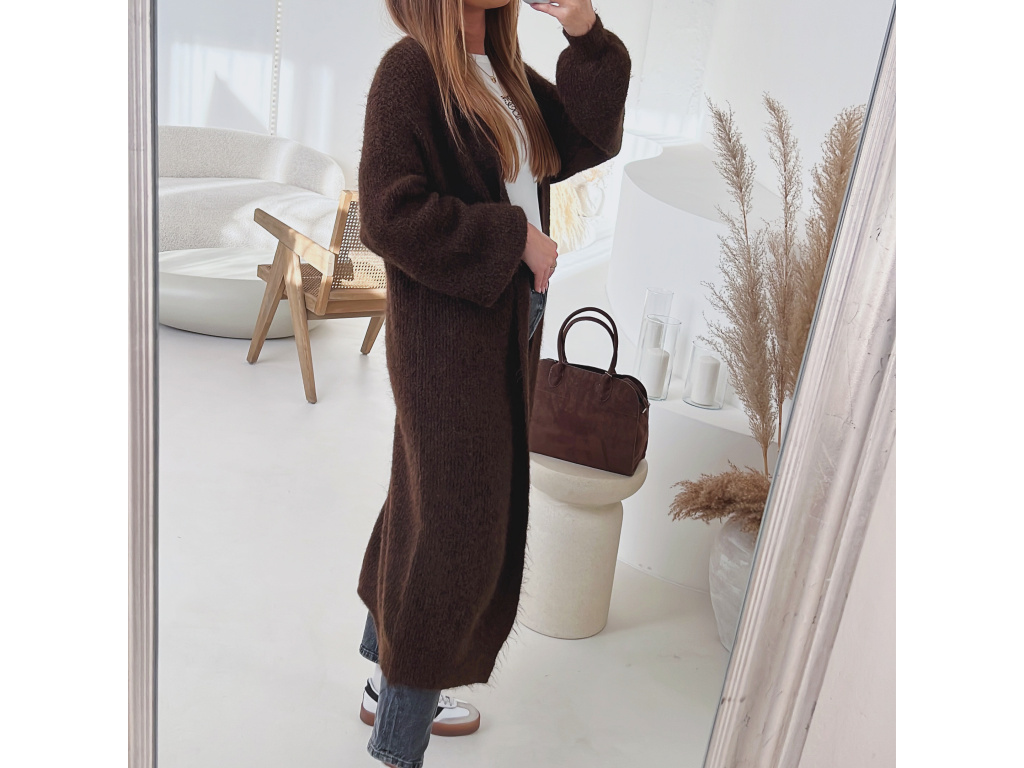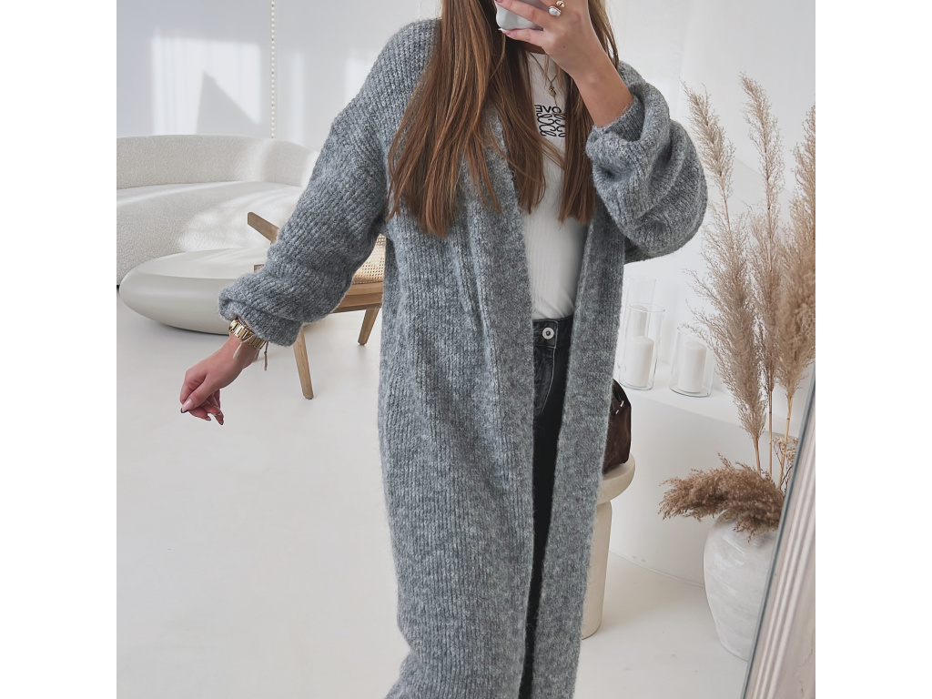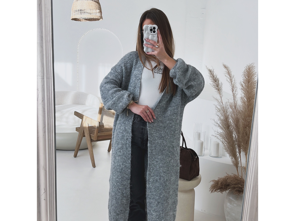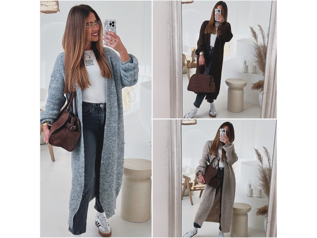 Stylový a hřejivý dlouhý kardigan s volnějším střihem, ideální pro vrstvení v chladnějších dnech. Příjemný měkký úplet zaručuje pohodlí i elegantní vzhled. Skvěle doplní ležérní outfit s džínami i šaty. Dostupný ve třech odstínech – šedé, béžové a hnědé.