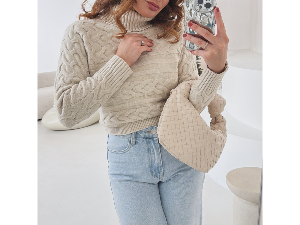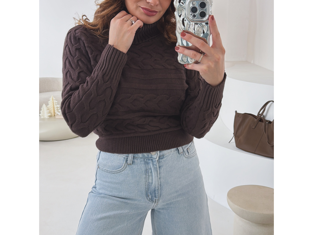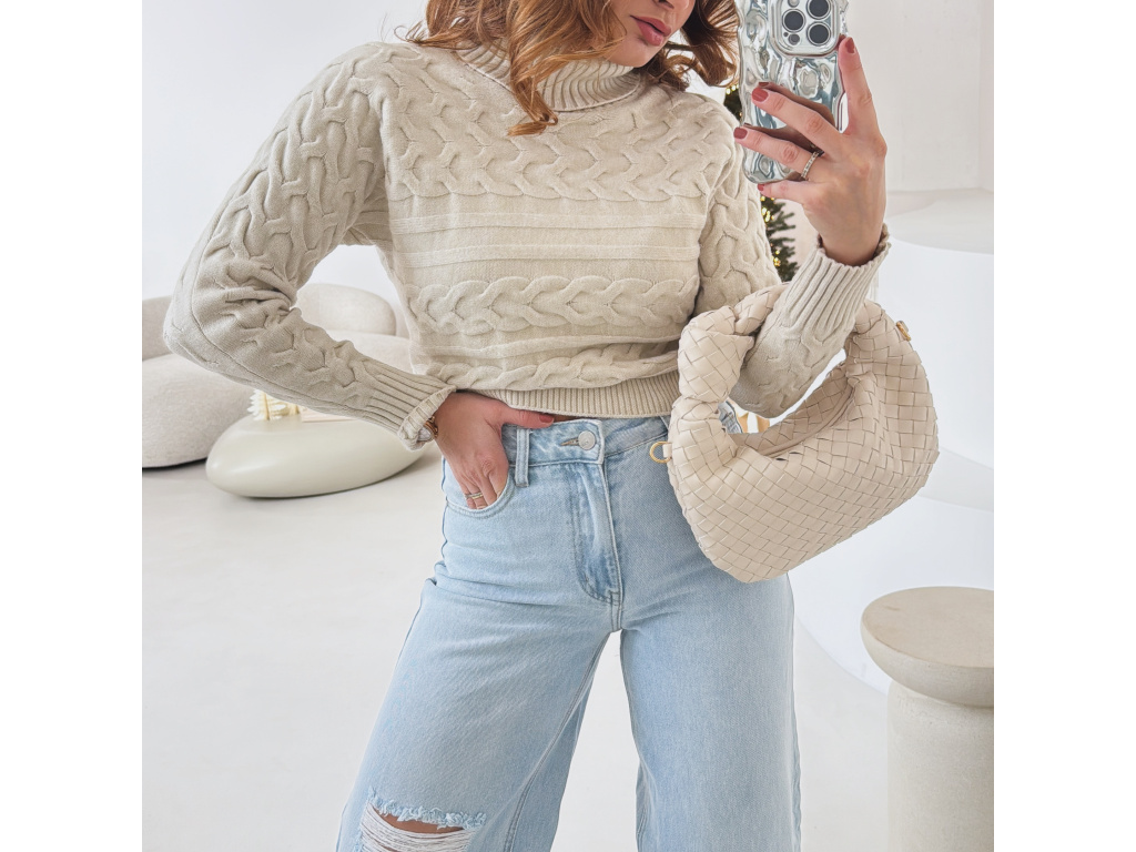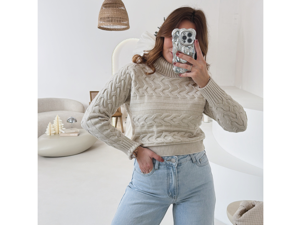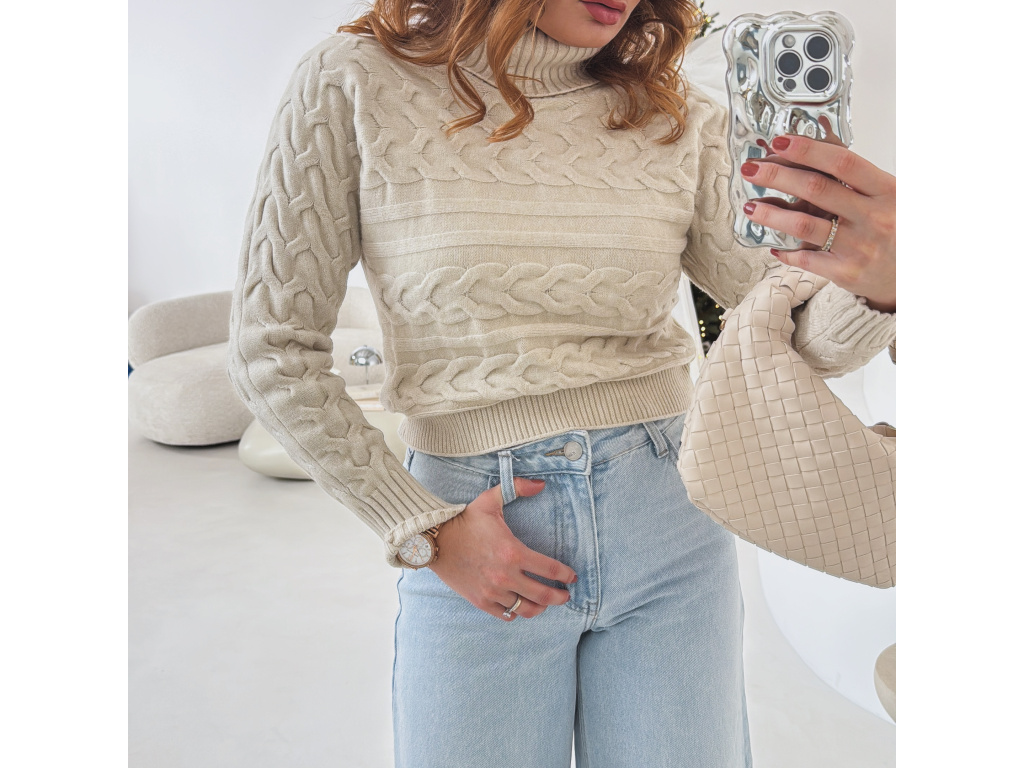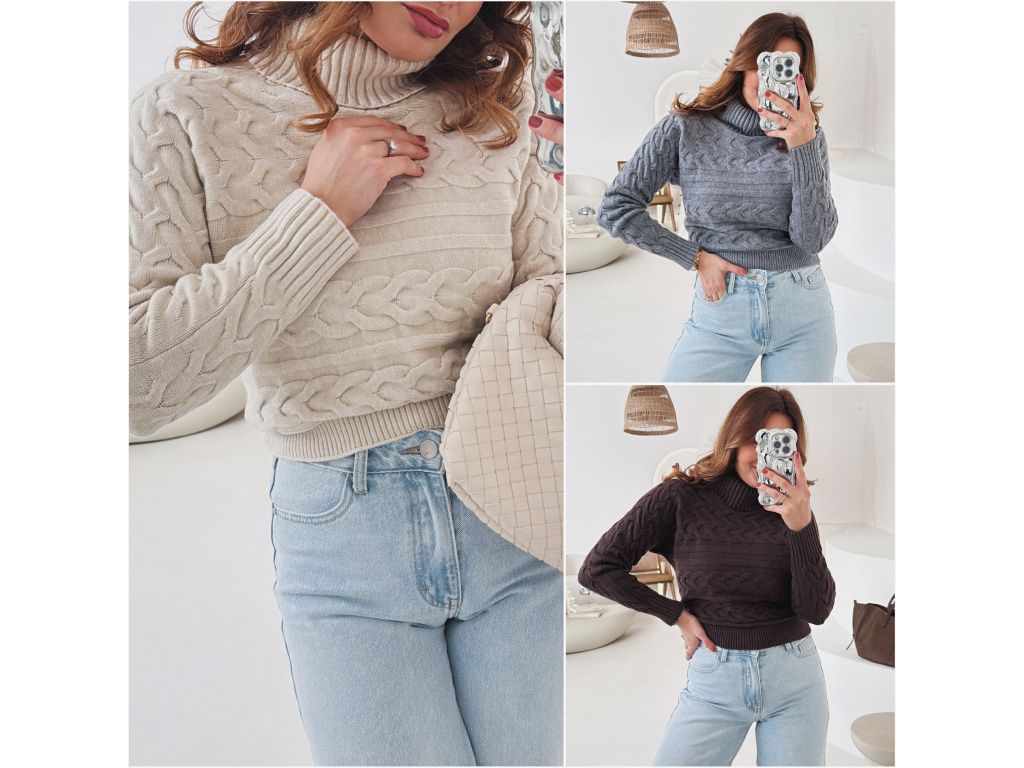 Stylový kratší rolákový svetr s výrazným pleteným vzorem, který zaujme svým extrémně příjemným a měkkým materiálem. Díky pohodlnému střihu krásně sedí a snadno se kombinuje s džínami i sukní. Dostupný v elegantní béžové, šedé a hnědé barvě — ideální kousek pro chladnější dny.