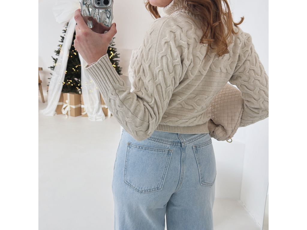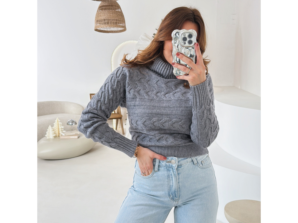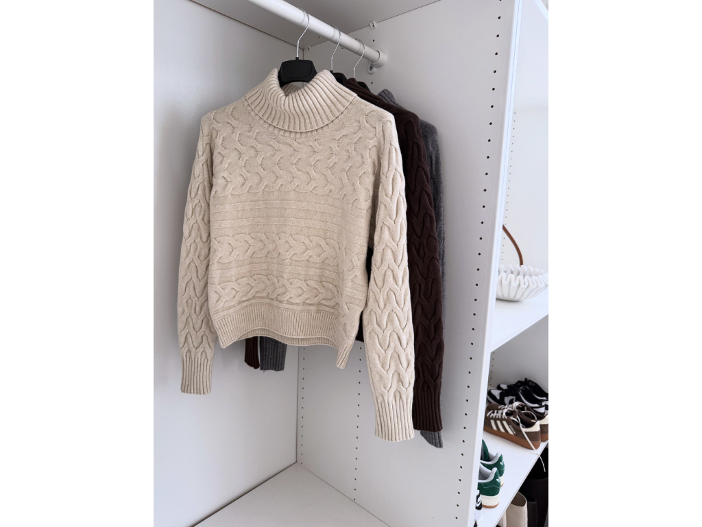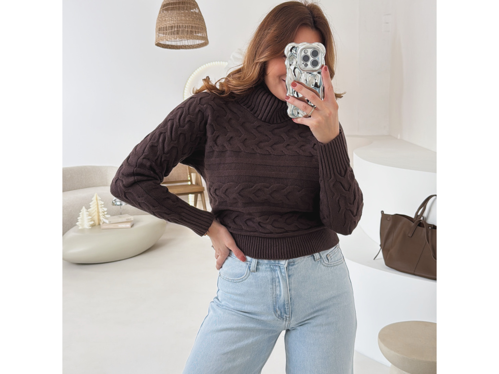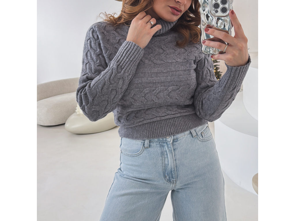 Stylový kratší rolákový svetr s výrazným pleteným vzorem, který zaujme svým extrémně příjemným a měkkým materiálem. Díky pohodlnému střihu krásně sedí a snadno se kombinuje s džínami i sukní. Dostupný v elegantní béžové, šedé a hnědé barvě — ideální kousek pro chladnější dny.