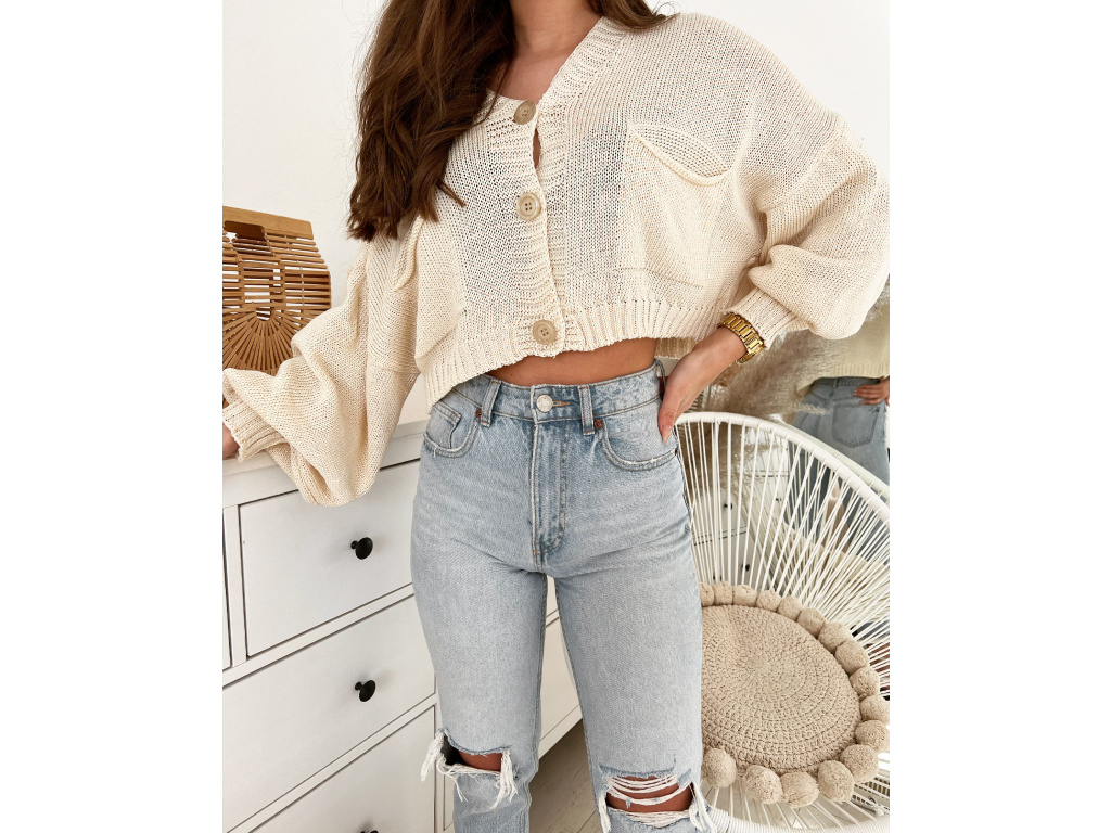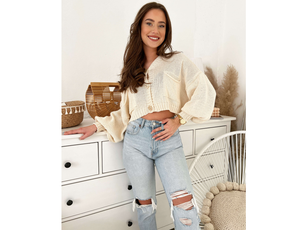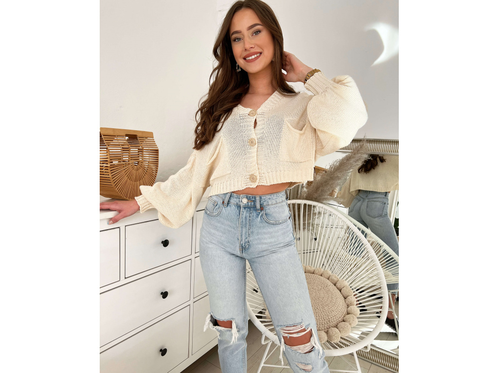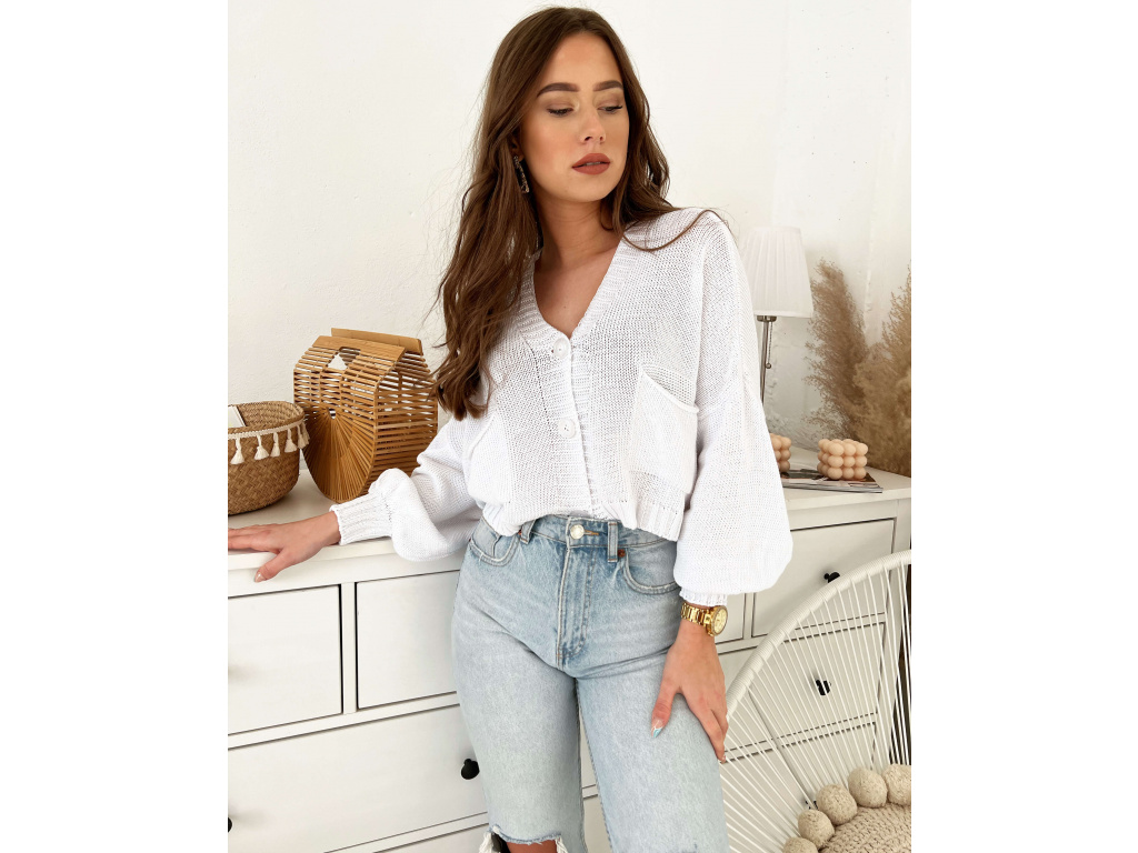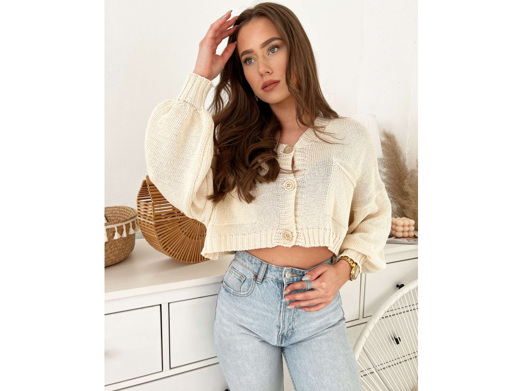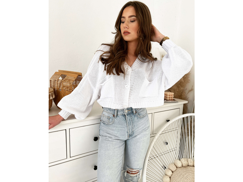 Moc příjemný svetr v bílé a béžové barvě kratšího střihu s balónovými rukávy. Velikost je univerzální, sedí na XS, S a M. Foceno je na XS a výšce 170 cm. DOPORUČUJEME! Ohledně rozměrů nás neváhejte kontaktovat.