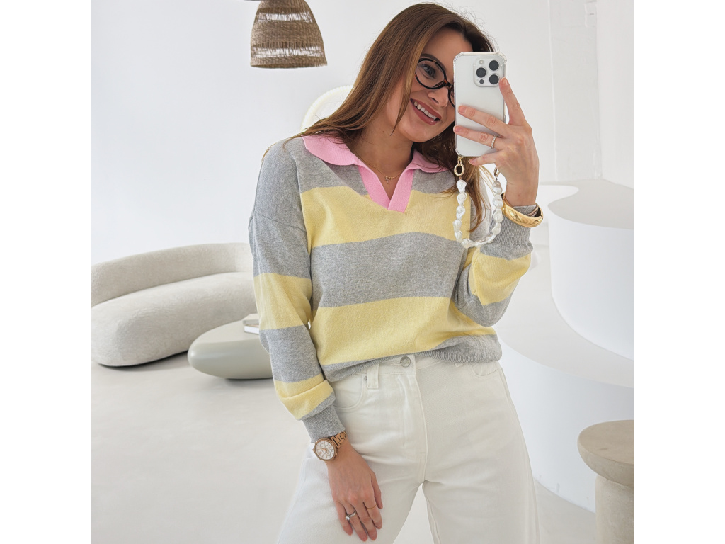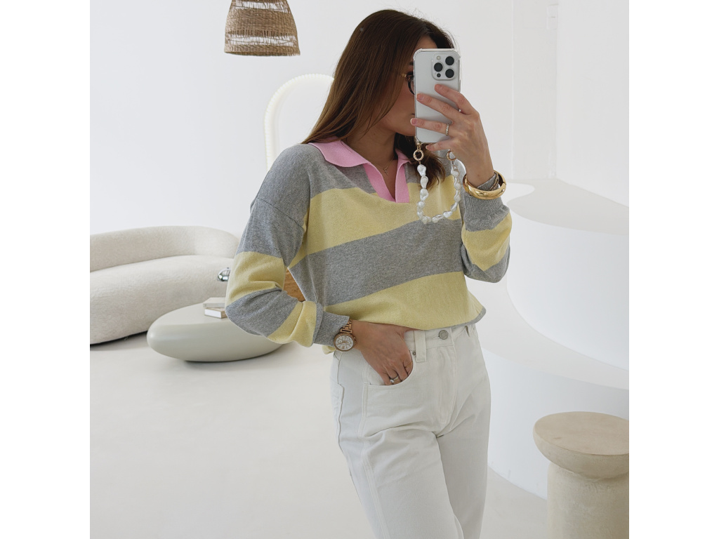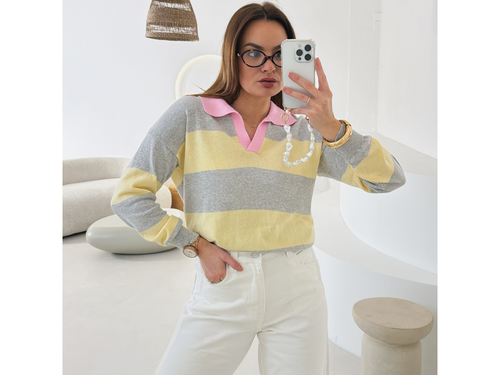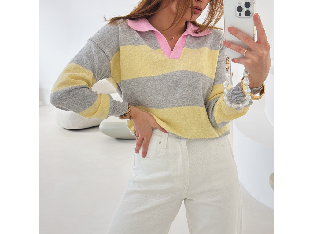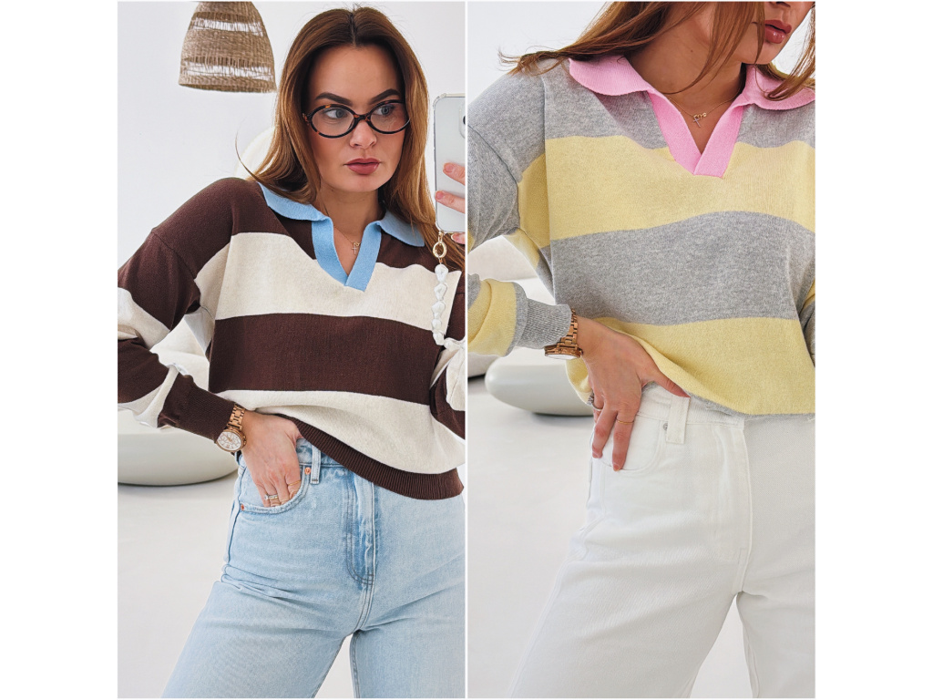 Stylový lehký svetřík s límečkem v moderním pruhovaném designu. Má pohodlný střih, jemný a příjemný materiál a kontrastní límec, který dodává celému kousku trendy sport-elegantní vzhled. Skvěle se kombinuje s džínami i elegantnějšími kalhotami. Ideální na každodenní nošení.
