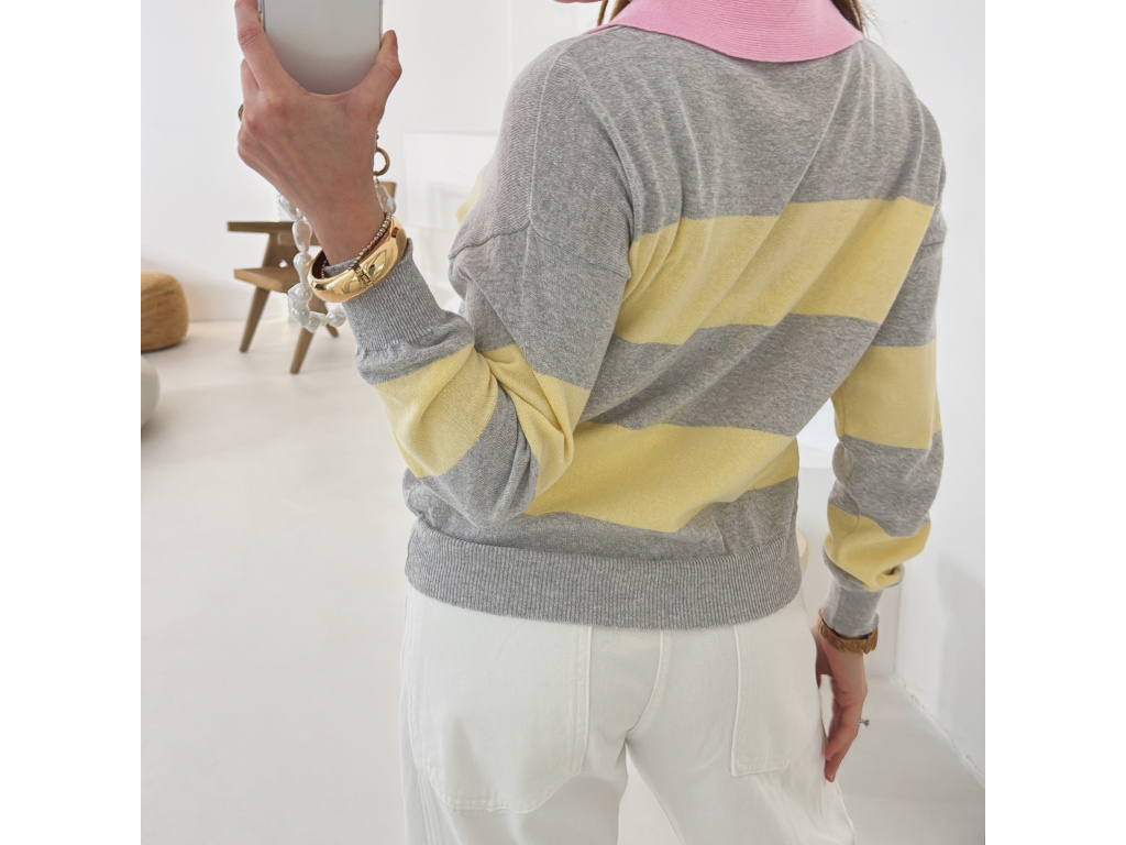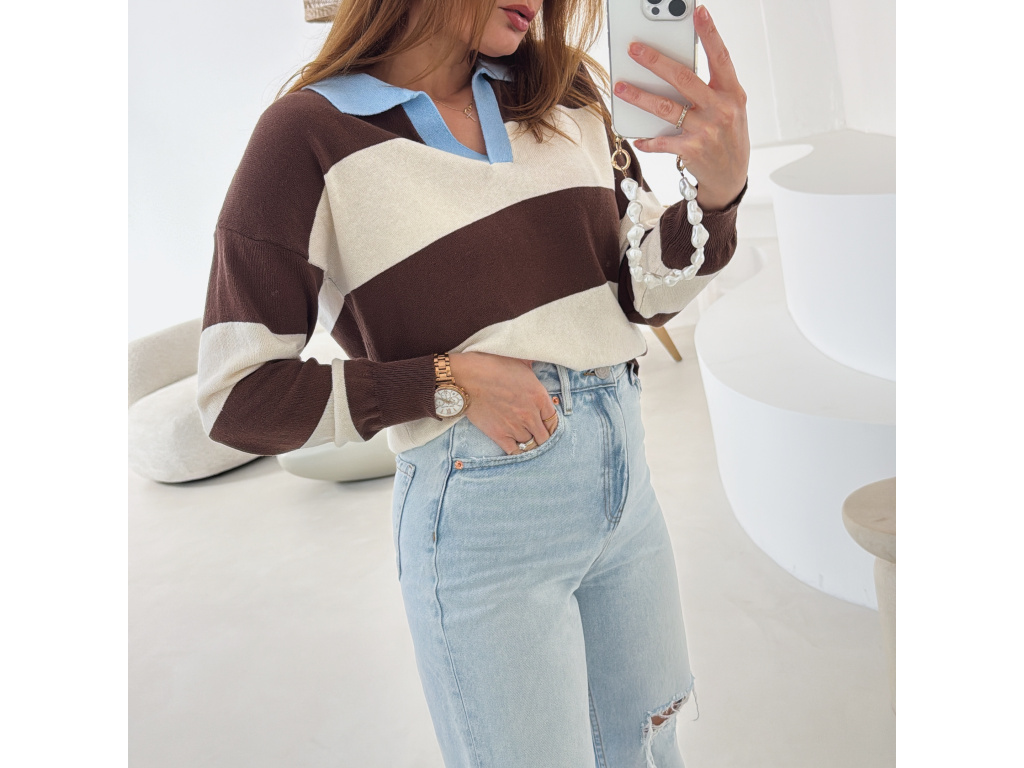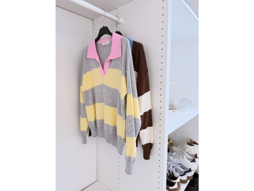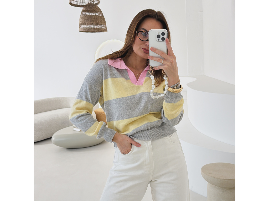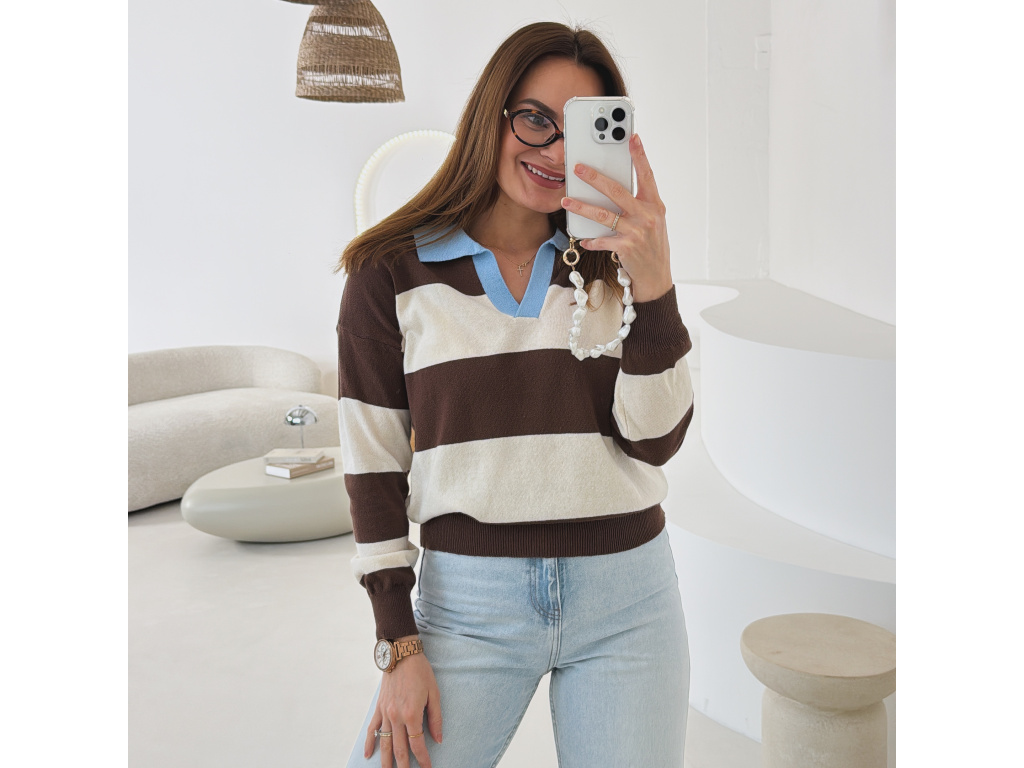 Stylový lehký svetřík s límečkem v moderním pruhovaném designu. Má pohodlný střih, jemný a příjemný materiál a kontrastní límec, který dodává celému kousku trendy sport-elegantní vzhled. Skvěle se kombinuje s džínami i elegantnějšími kalhotami. Ideální na každodenní nošení.