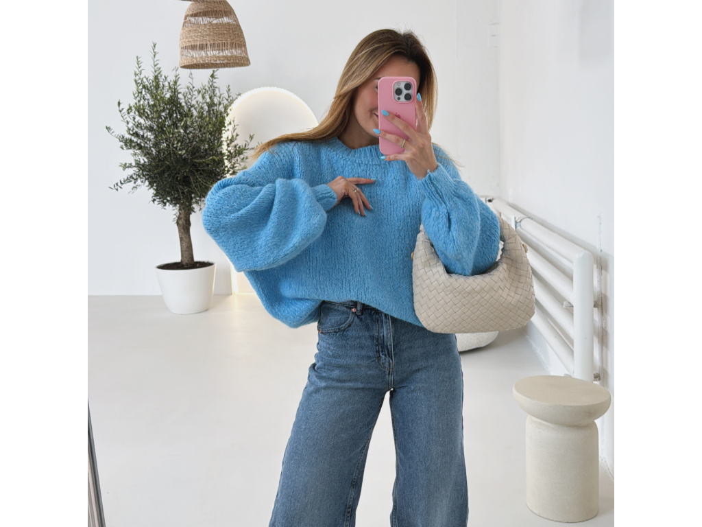 Extra příjemný svetr s podílem vlny velice hezkého oversize volnějšího střihu v modré a tyrkysové barvě. Materiál nekouše! Velikost je univerzální, sedí na XS až L. Foceno je na výšce 165 cm a velikosti XS.