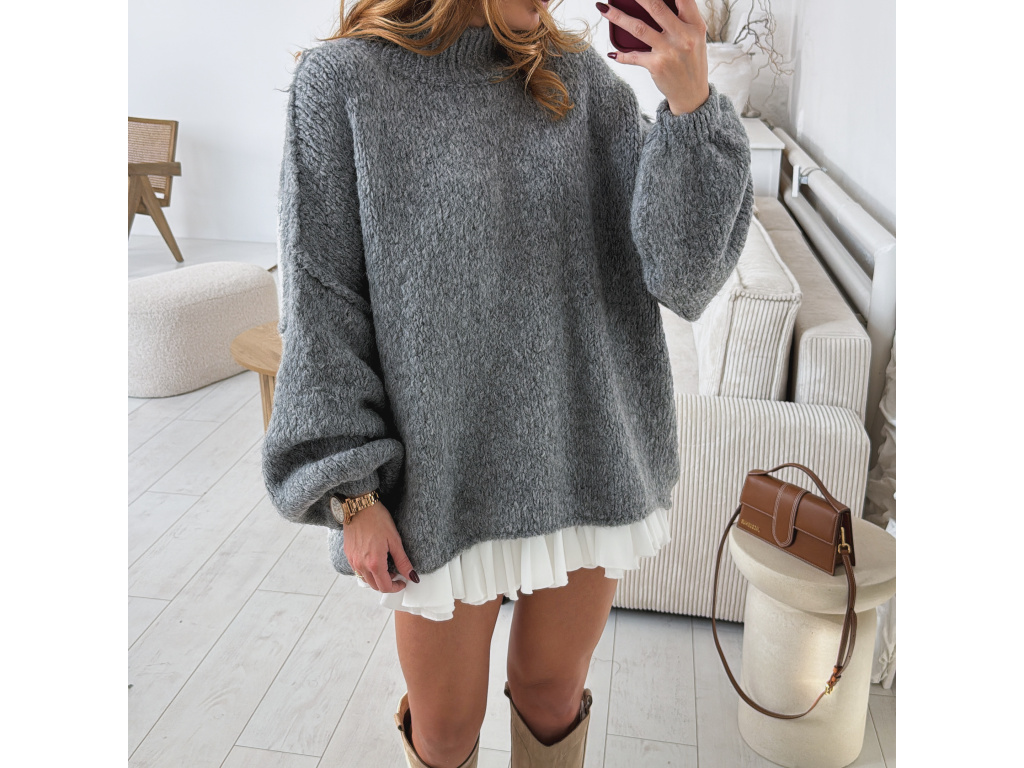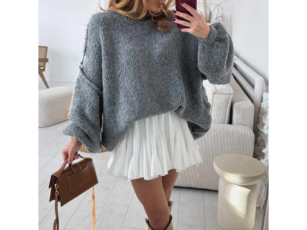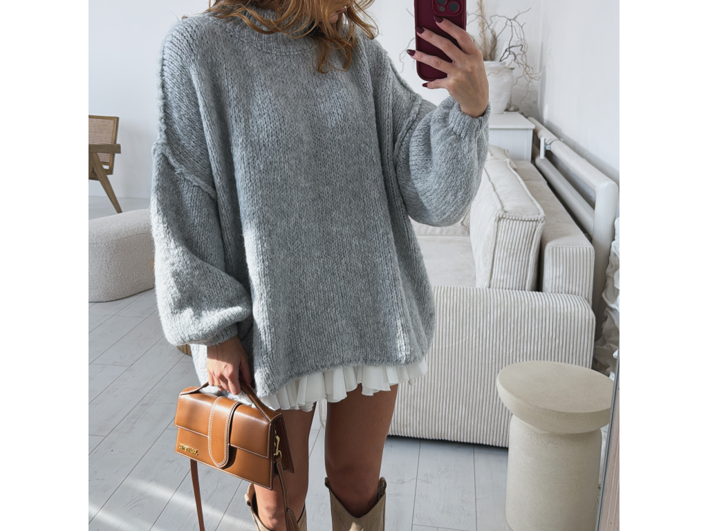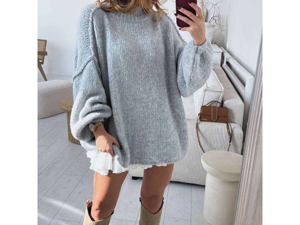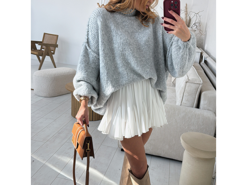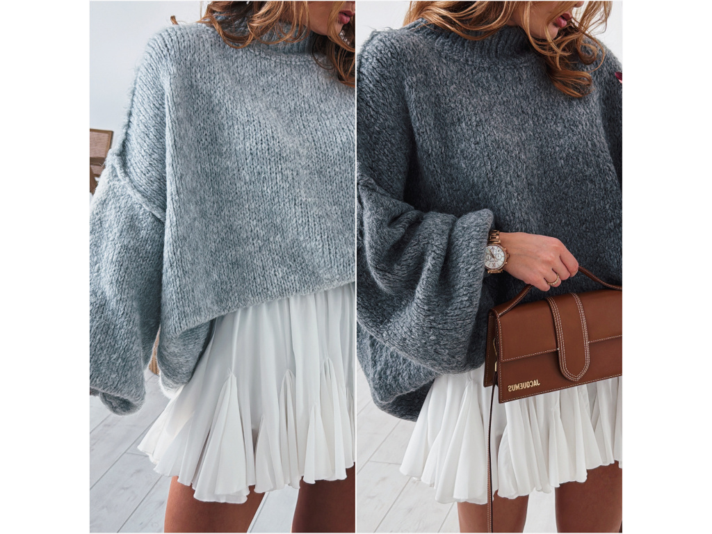 Extra příjemný svetr s podílem vlny velice hezkého oversize volnějšího střihu ve světle šedé a tmavě šedé barvě. Materiál nekouše! Velikost je univerzální, sedí na XS až XL. Foceno je na výšce 165 cm a velikosti XS. Na velikosti XS a S bude svetr volnější.