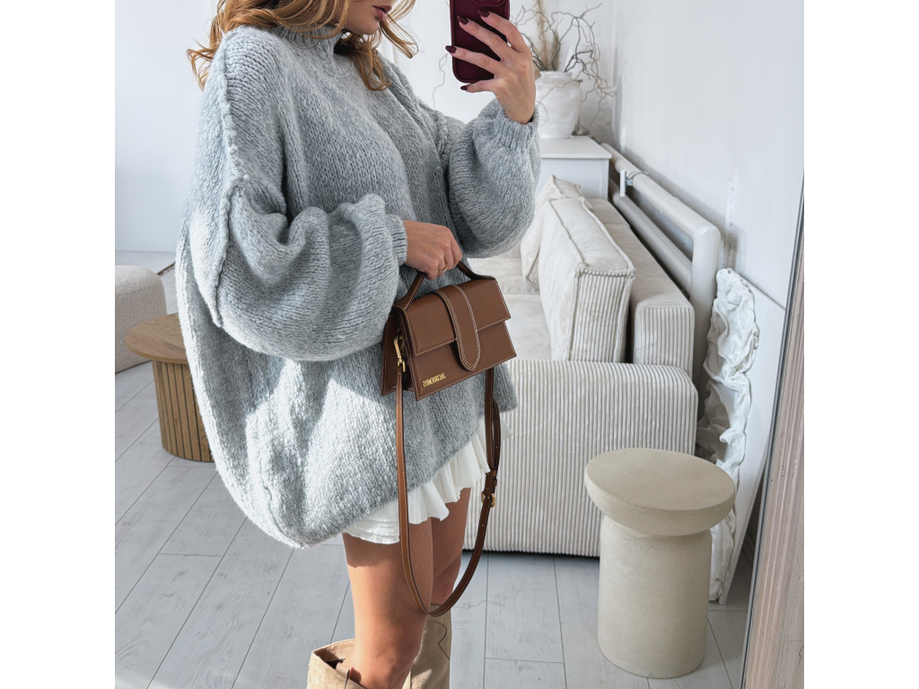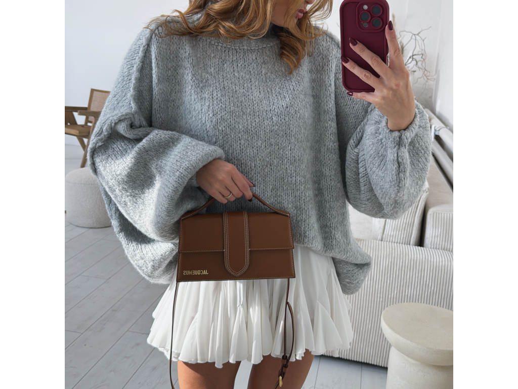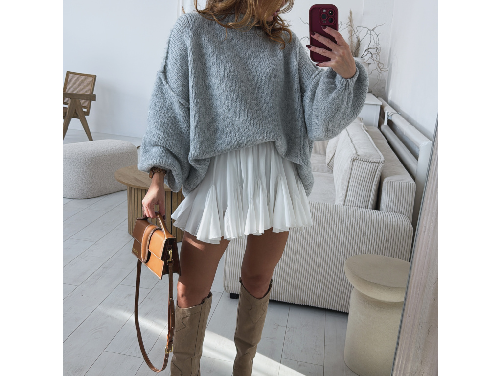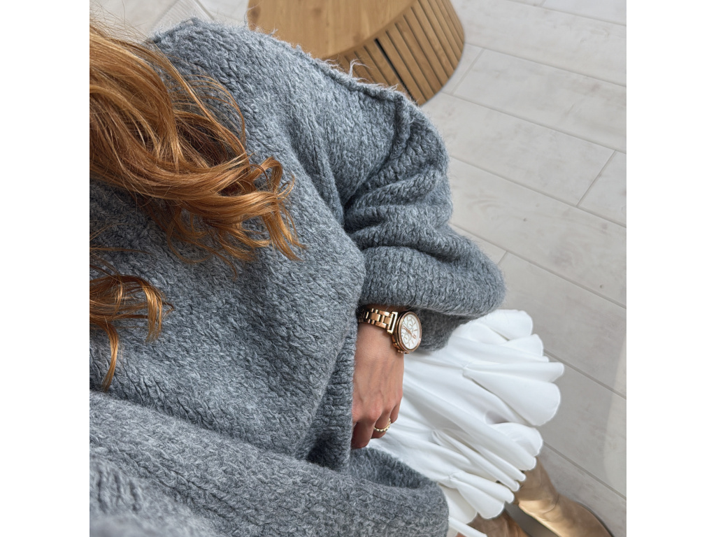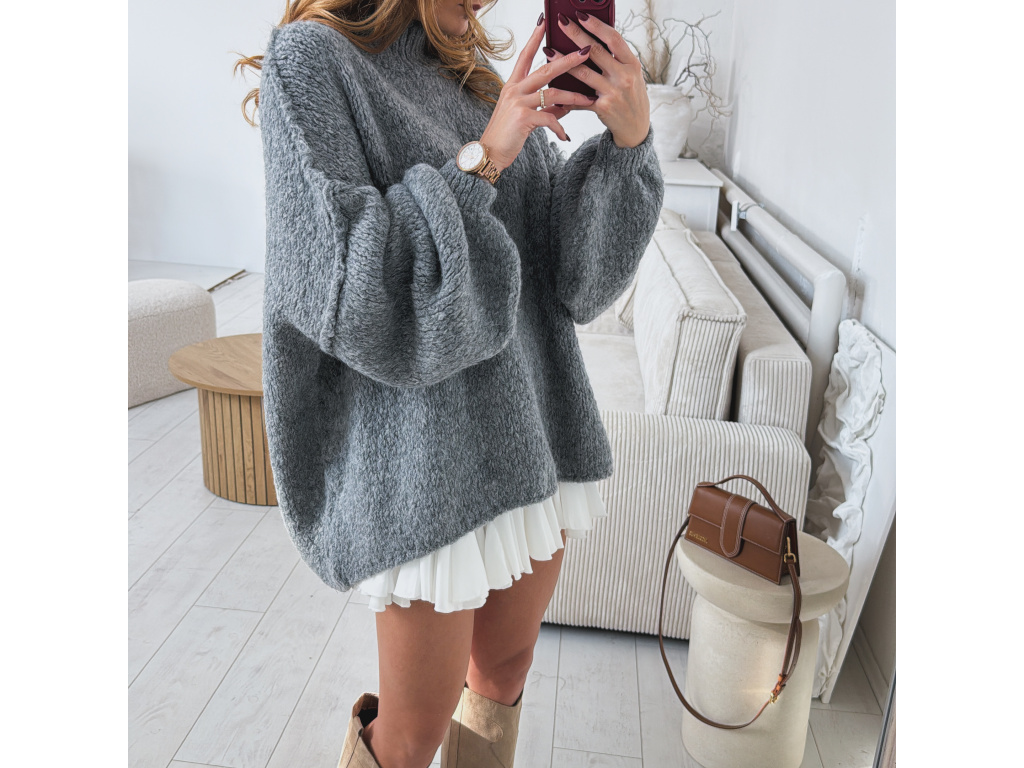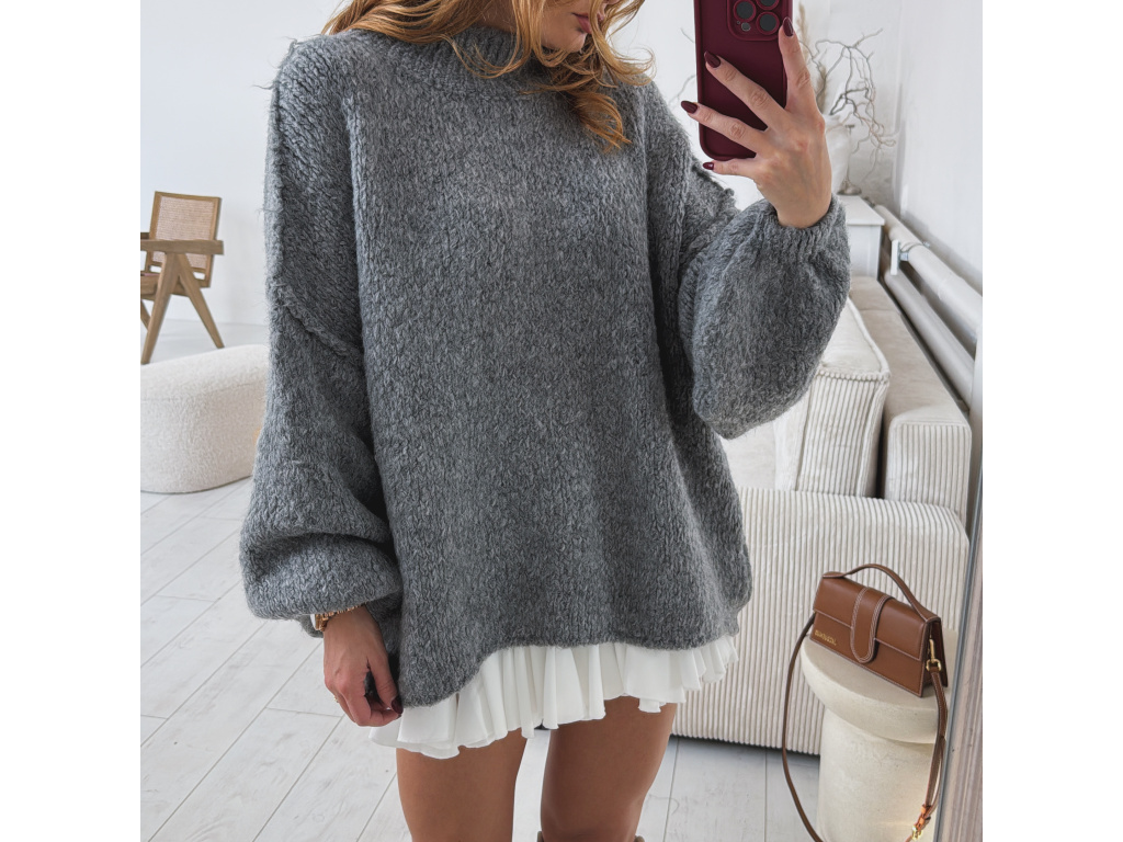 Extra příjemný svetr s podílem vlny velice hezkého oversize volnějšího střihu ve světle šedé a tmavě šedé barvě. Materiál nekouše! Velikost je univerzální, sedí na XS až XL. Foceno je na výšce 165 cm a velikosti XS. Na velikosti XS a S bude svetr volnější.