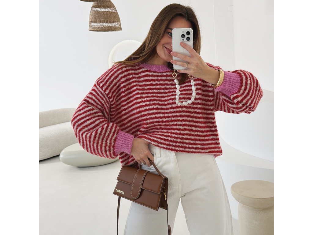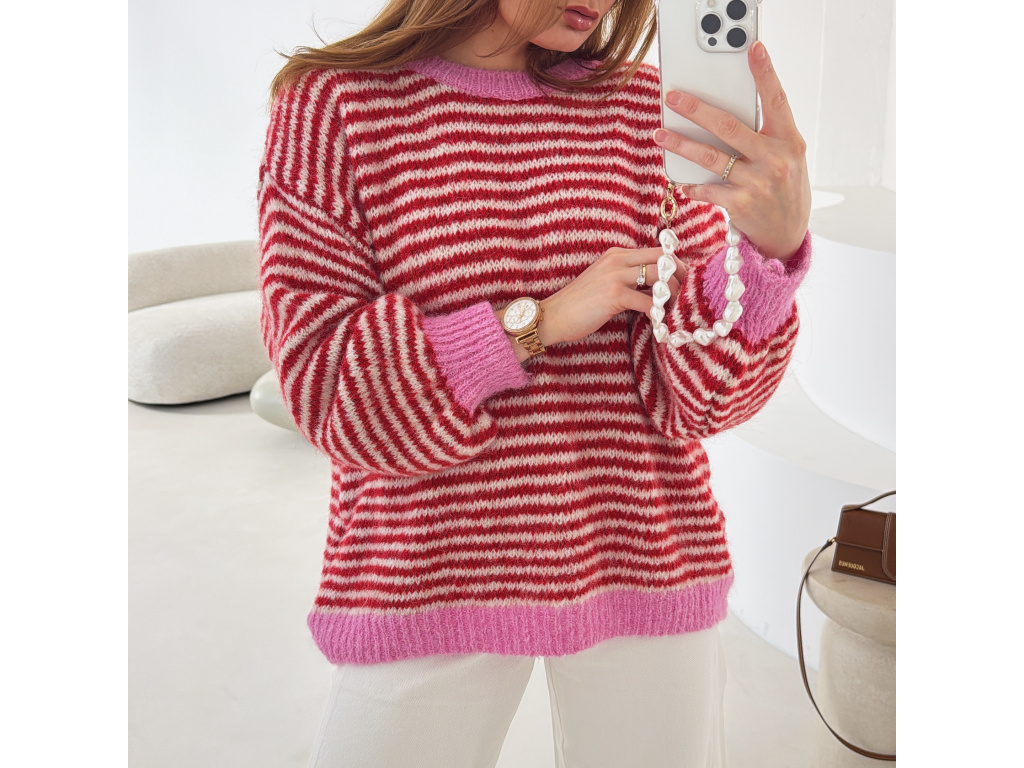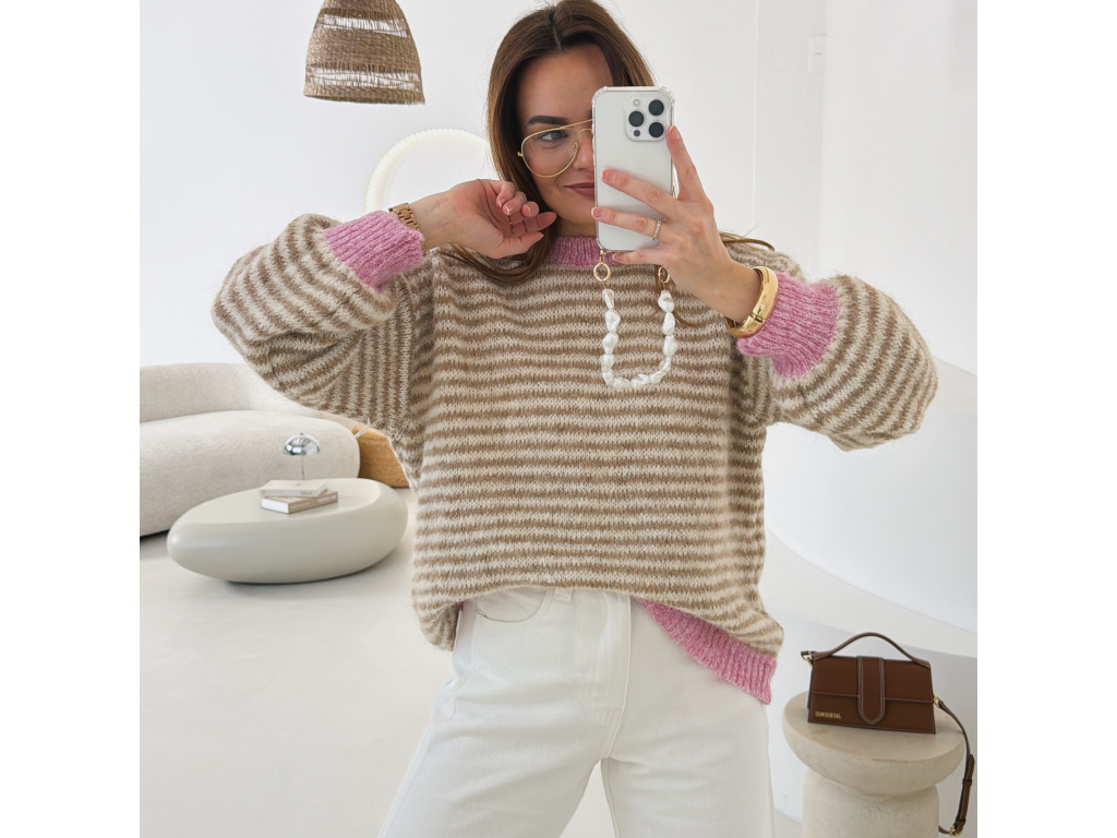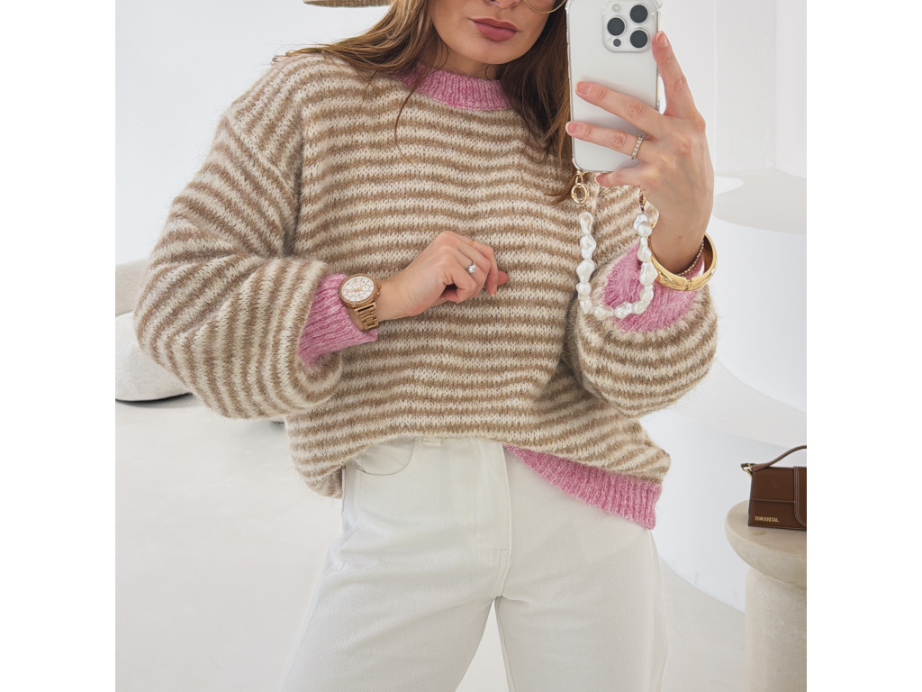 Stylový pruhovaný svetr v nadčasovém designu, který zaujme kombinací jemných barev a kontrastních lemů. Je ušitý z příjemného, měkkého materiálu, který zahřeje a zároveň působí lehce. Volnější střih zajišťuje pohodlí při nošení a snadné kombinování s džínami, kalhotami i sukní. Ideální kousek pro každodenní outfity, kterým dodá hravost a svěží vzhled.