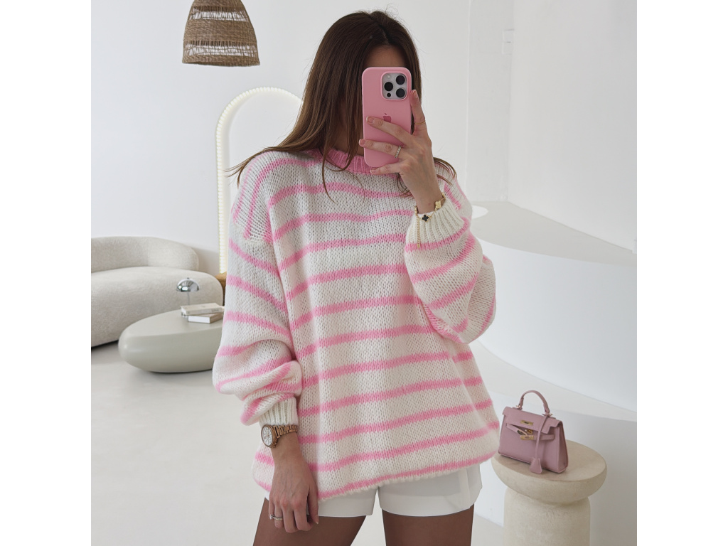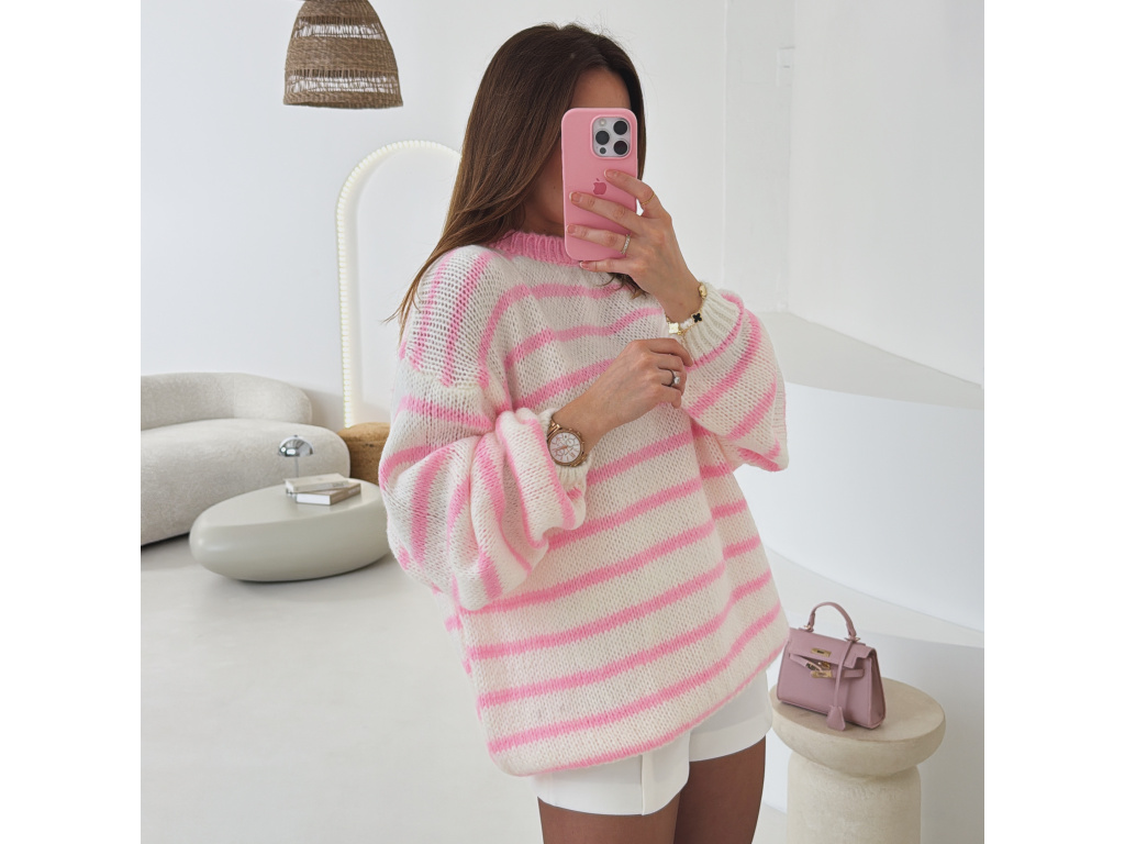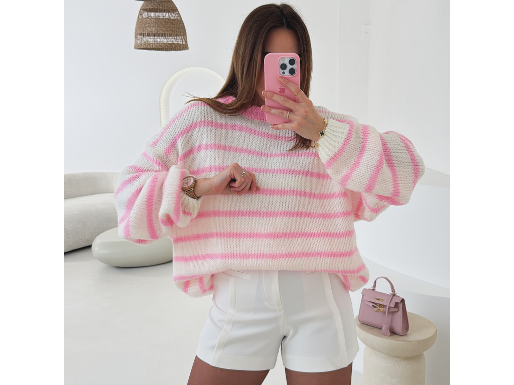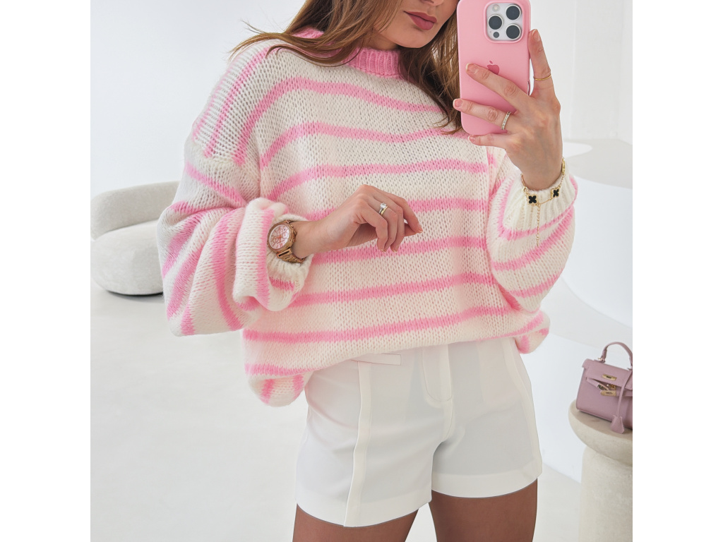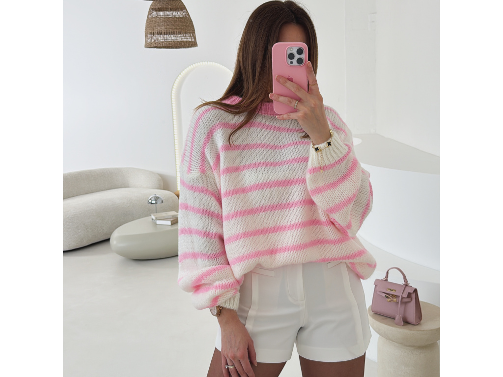 Měkký pruhovaný svetr v bílo-růžové kombinaci, který působí svěže a žensky. Volnější střih a příjemný pletený materiál zajišťují maximální pohodlí při nošení. Ideální kousek pro každodenní outfit i ležérně elegantní kombinace.