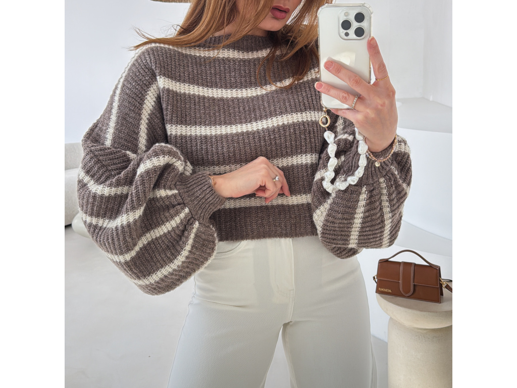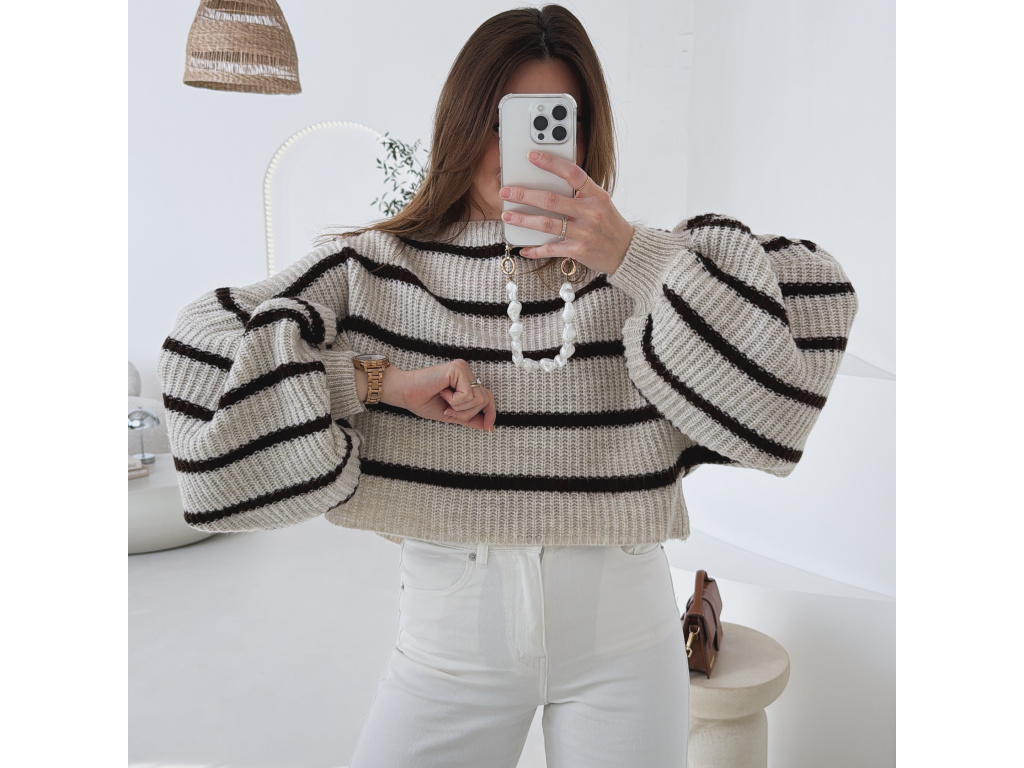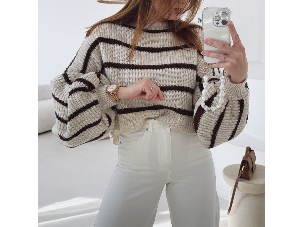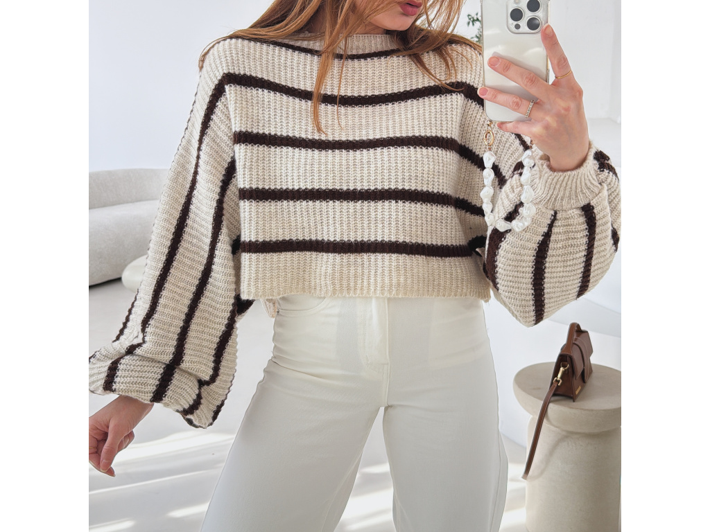 Stylový krátký svetřík s moderním pruhovaným vzorem, který dodá outfitu šmrnc. Má volnější střih a výrazné balonové rukávy, díky kterým působí velmi trendy a ženský. Příjemný pletený materiál je pohodlný na nošení a skvěle se kombinuje s džínami, kalhotami i sukní s vyšším pasem.