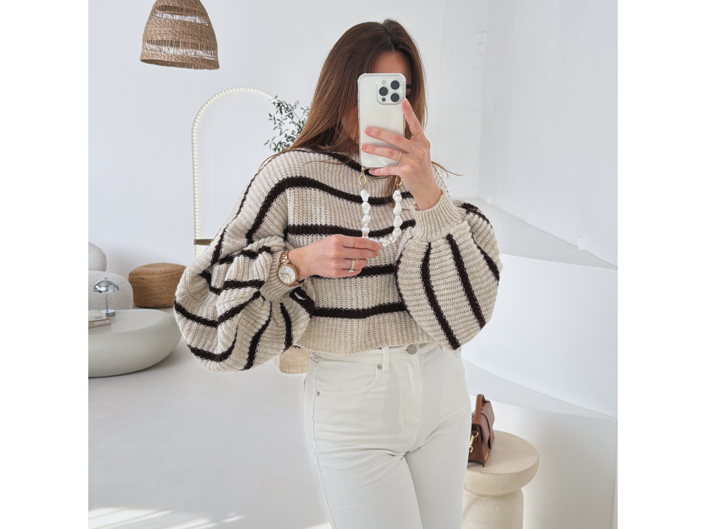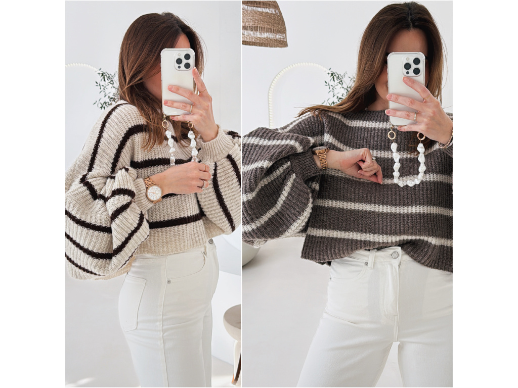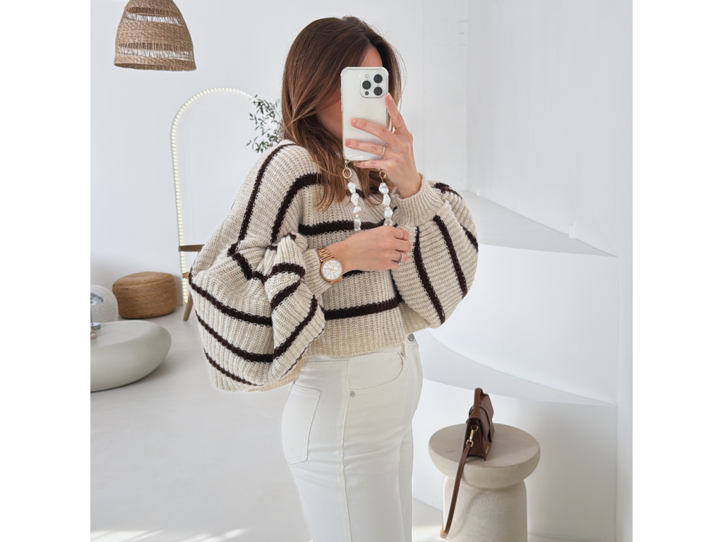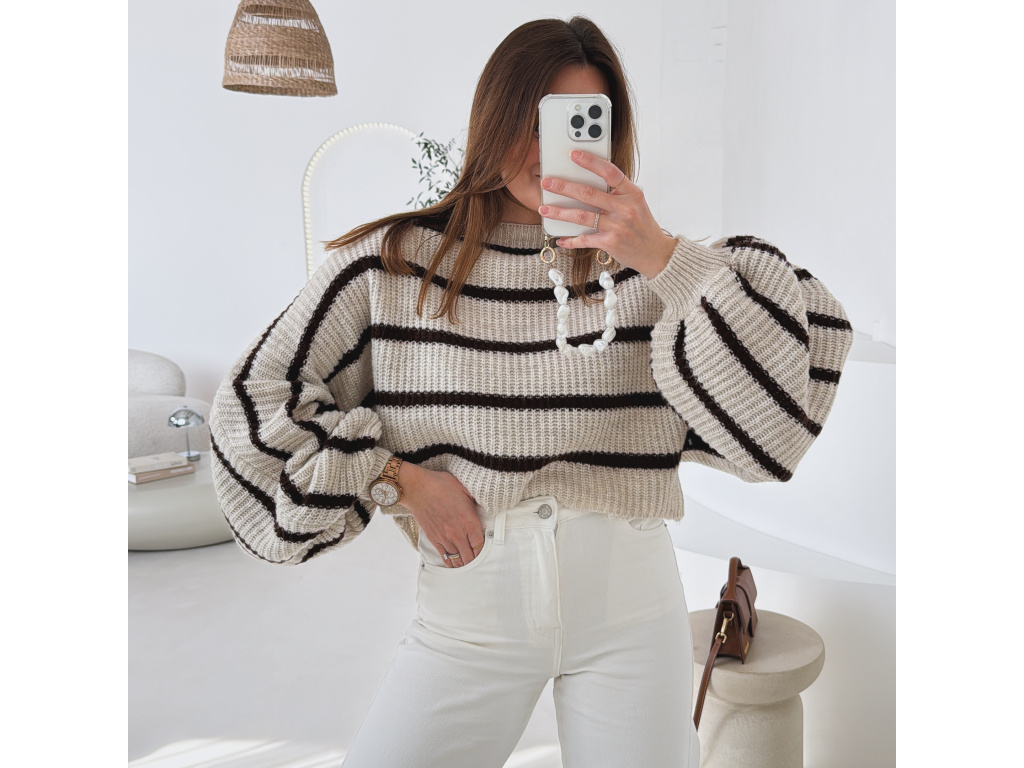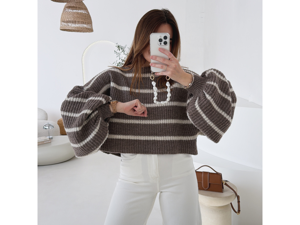 Stylový krátký svetřík s moderním pruhovaným vzorem, který dodá outfitu šmrnc. Má volnější střih a výrazné balonové rukávy, díky kterým působí velmi trendy a ženský. Příjemný pletený materiál je pohodlný na nošení a skvěle se kombinuje s džínami, kalhotami i sukní s vyšším pasem.